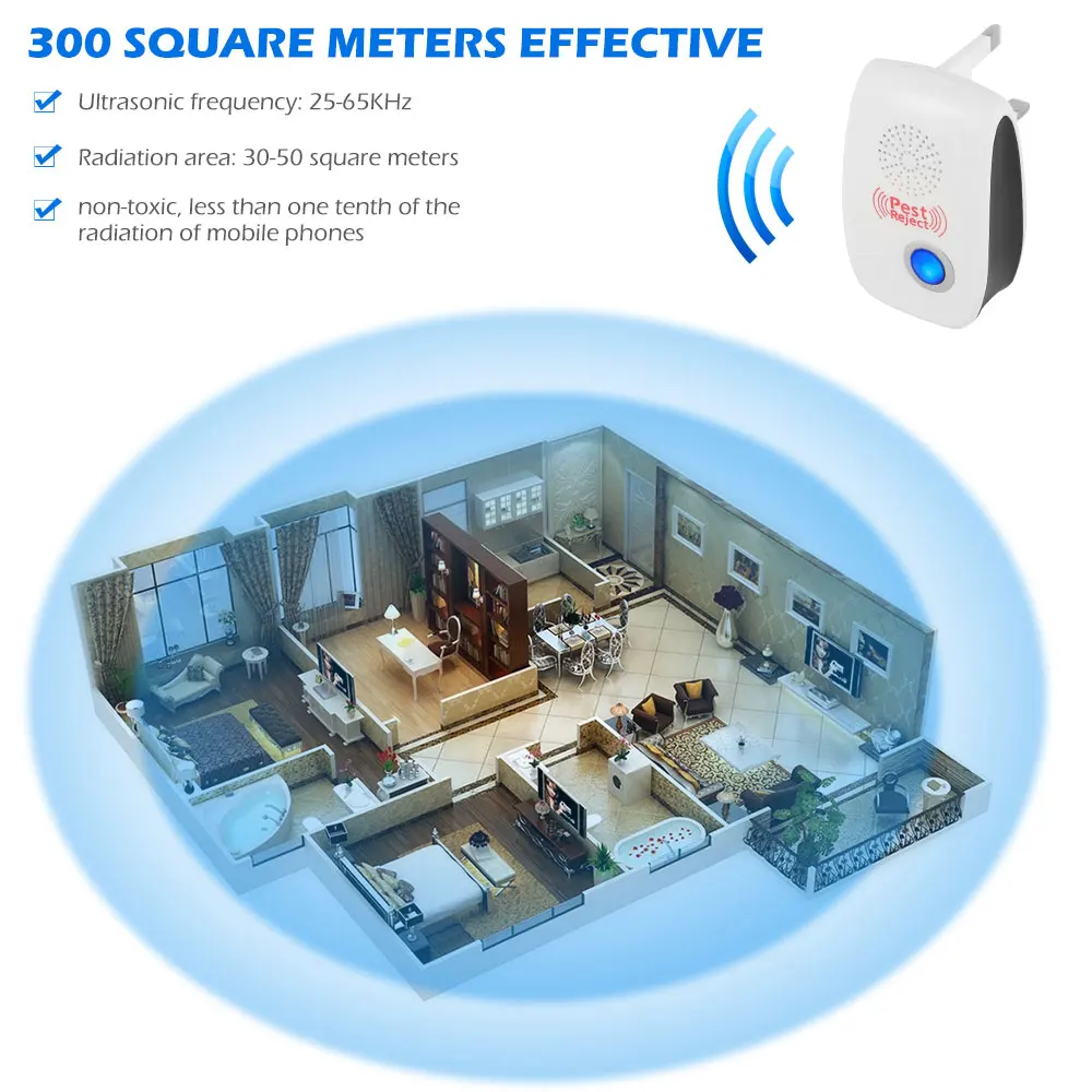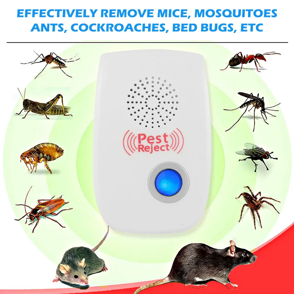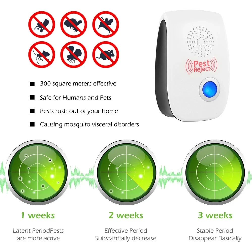 Ультразвуковой отталкивающий вредителей использует двойную ультразвуковую и электромагнитную технологию чипов одновременно для дезориентирования слуха и нервной системы вредителей, чтобы быстро и мощно увезти их. Он может удалять большинство типов летающих и ползающих вредителей, таких как комары, пауки, клопы кровати, тараканы, мыши, блохи, муравьи, фруктовые мухи и т. д.