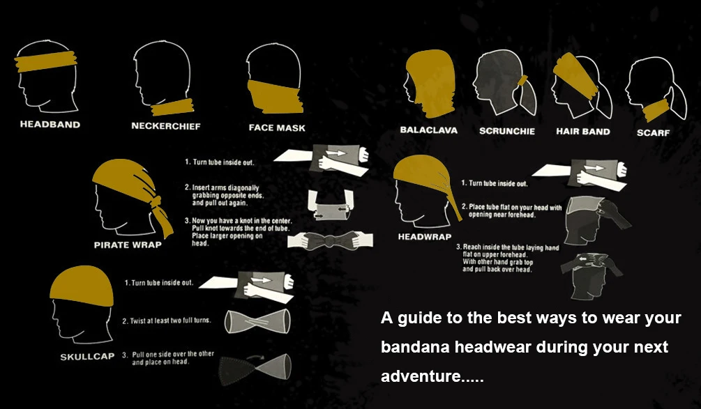 -Головной убор-бандана-это товар, положивший начало бесшовной многофункциональной революции бандана. Головной убор и ожерелье созданы, чтобы превратиться в множество различных предметов одежды за секунды, позволяет владельцу сменить шарф-бандану на лету, обеспечивая защиту от элементов во время широкого спектра активного отдыха и занятий спортом.