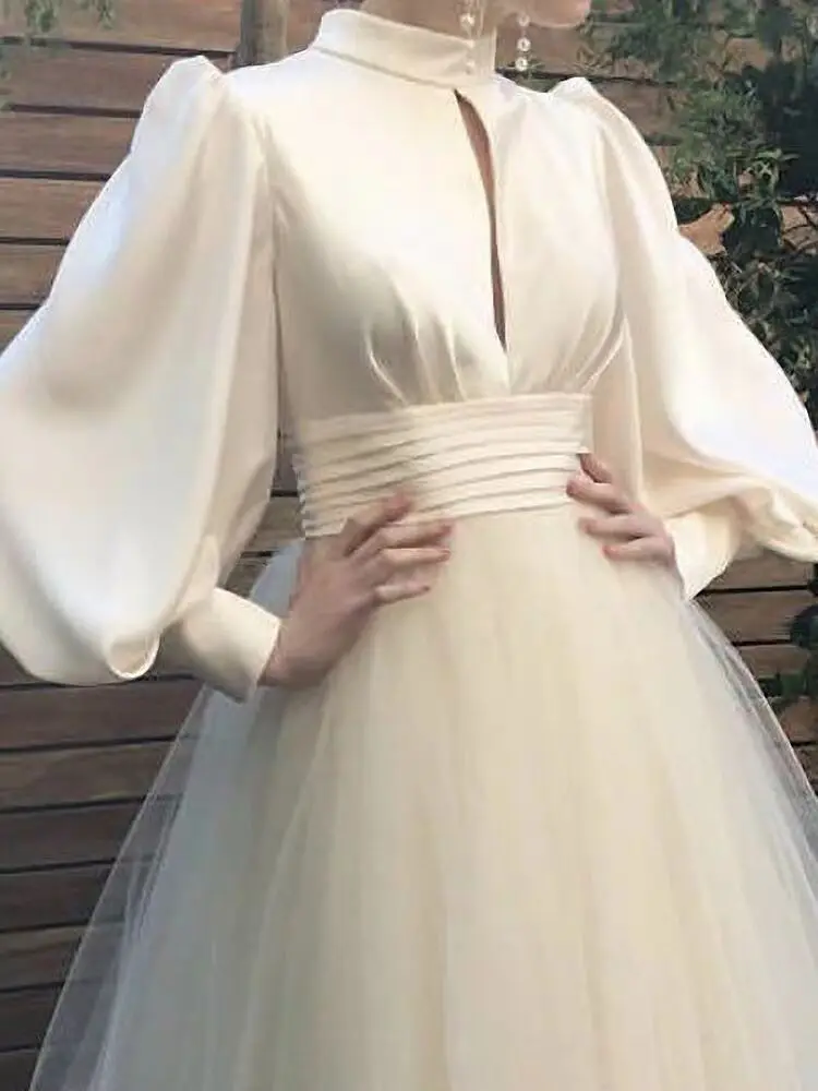 Короткое свадебное платье с пышными рукавами и воротником в виде се...