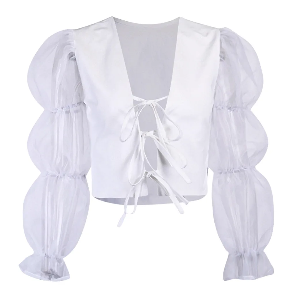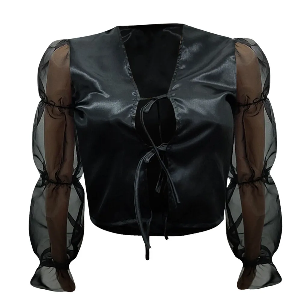 Рубашка Женская кружевная с длинными рукавами, пикантная кружевная сетчатая блузка принцессы с буффами на рукавах, с глубоким V-образным вырезом, на бретелях, Черная