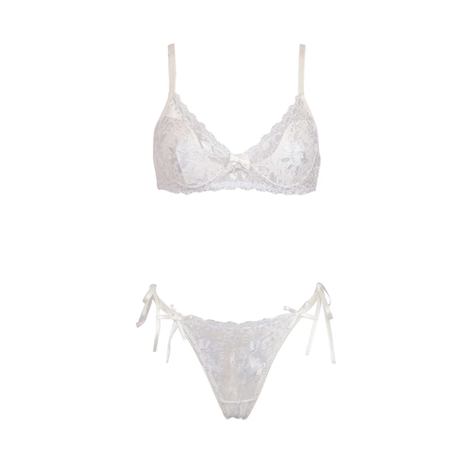 Женский сексуальный кружевной комплект нижнего белья с бантом --- в основном он просвечивает и является типичным представителем романтической внутренней красоты. Очаровательный Комплект Из бюстгальтер с оборками трусиков, привносит элегантность в вашу коллекцию нижнего белья, идеально подходит для свадебной ночи, медового месяца, подарков на юбилей и каждой особенной ночи.