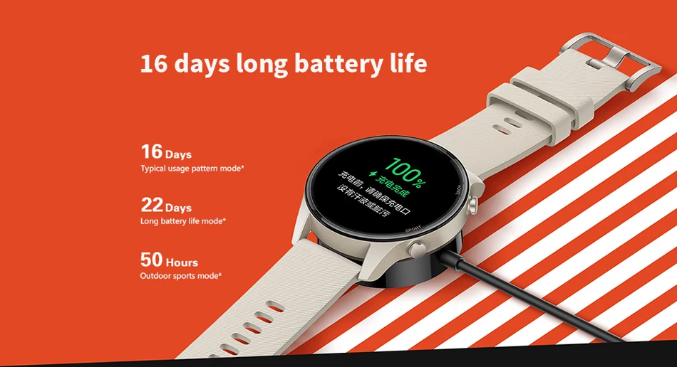16 дней долгий срок службы батареиОбновленный алгоритм AI с низким энергопотреблением снова улучшает Срок службы батареи часов. 16 дней типичный режим использования 22 дня долгий срок службы батареи 50 часов Спорт на открытом воздухе режим