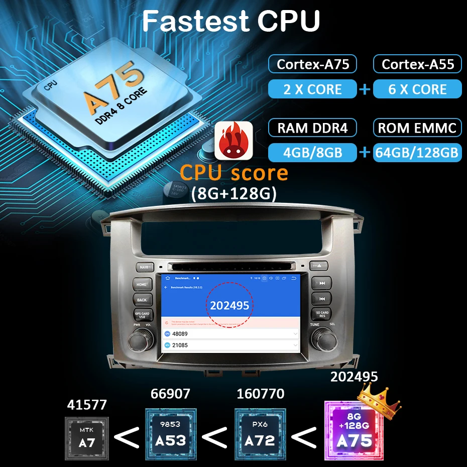 Самый быстрый процессорСамый быстрый процессор на современном рынке.Лучше, чем PX5 PX6 7862 9853 или другие ЦПAntutu Score- 202495, это самый высокий балл во всех ЦП в настоящее время