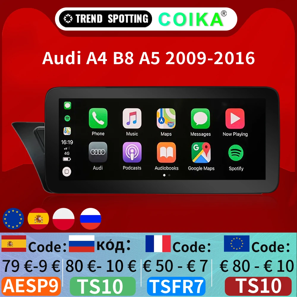 Автомобильная Мультимедийная система COIKA, 8 ядер, 4G, LTE, Wi-Fi, Android 10,0, для Audi A4, B8, A5, 2009-2016, BT, GPS, навигация, сенсорный экран, Carplay, 4 + 64 ГБ