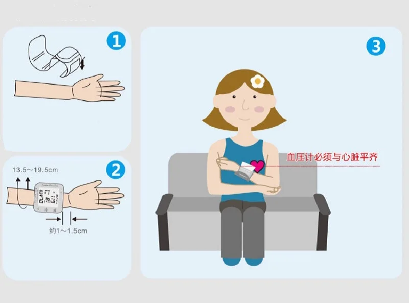 2. Перед измерением, сидите еще более 5 минут, держите грудь и измерьте, держите Монитор артериального давления и сердце одновременно на один рост и близко к сердцу левой груди.