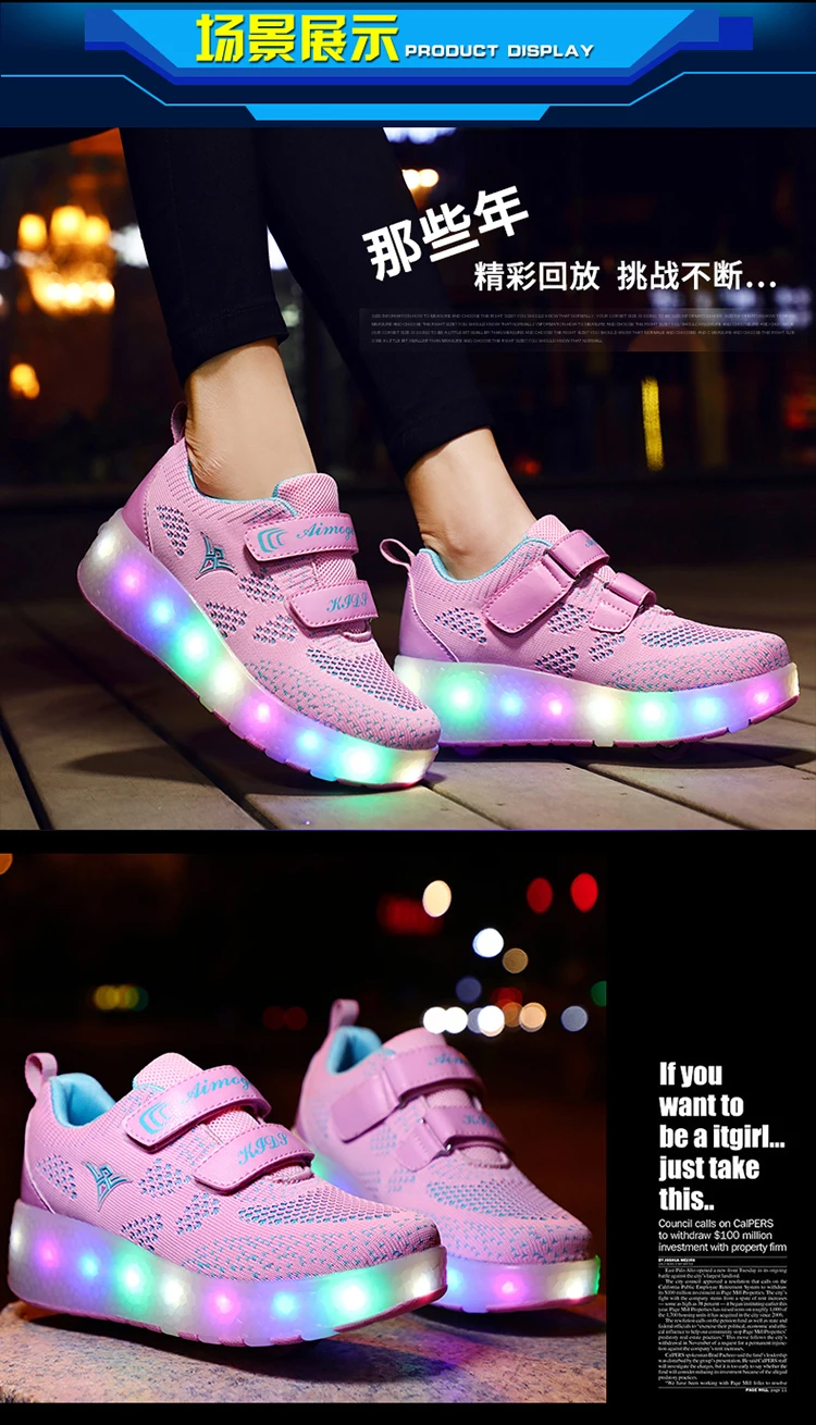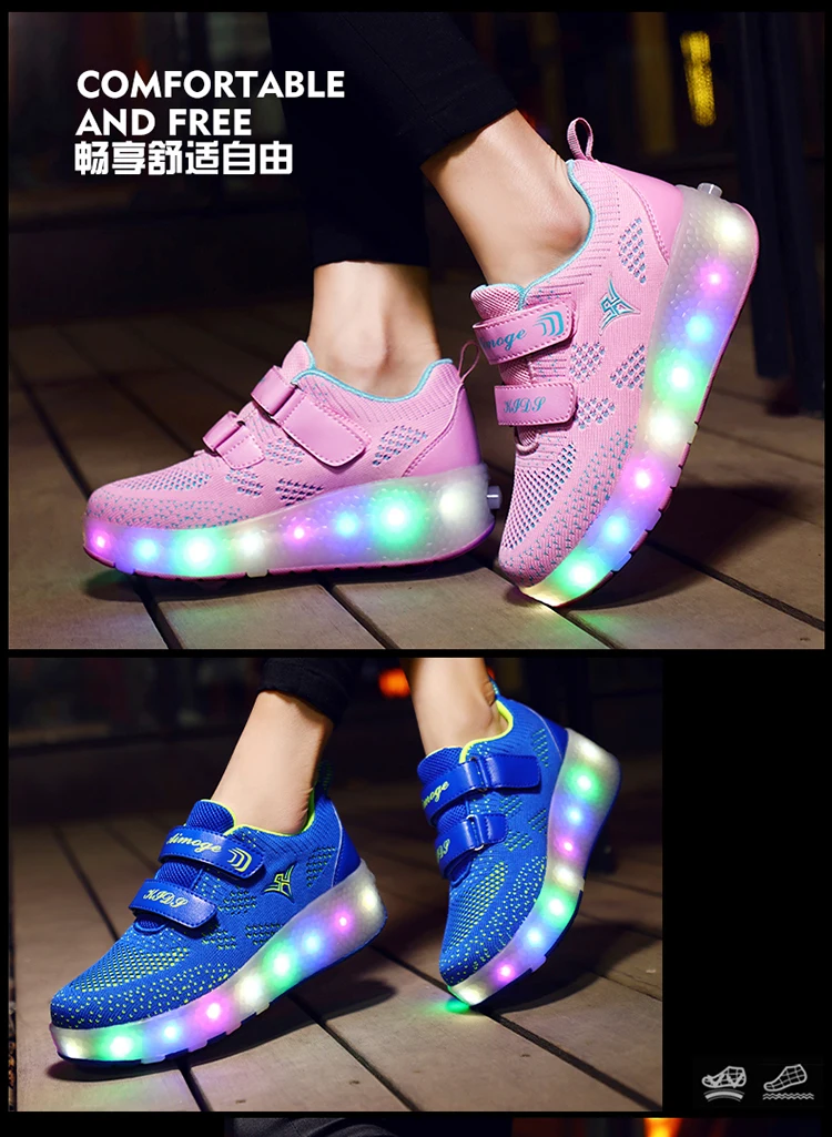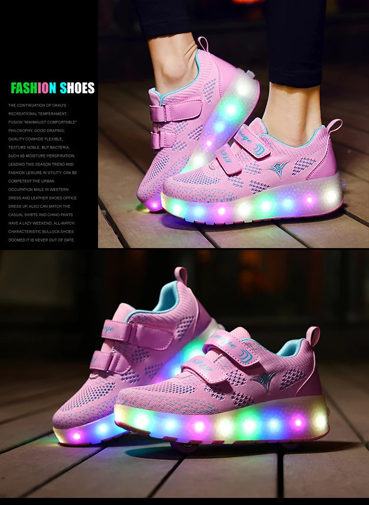 Детские кроссовки с колесиками, модная обувь для роликовых коньков, со светодиодсветильник кой, зарядка через USB, розовые синие красные