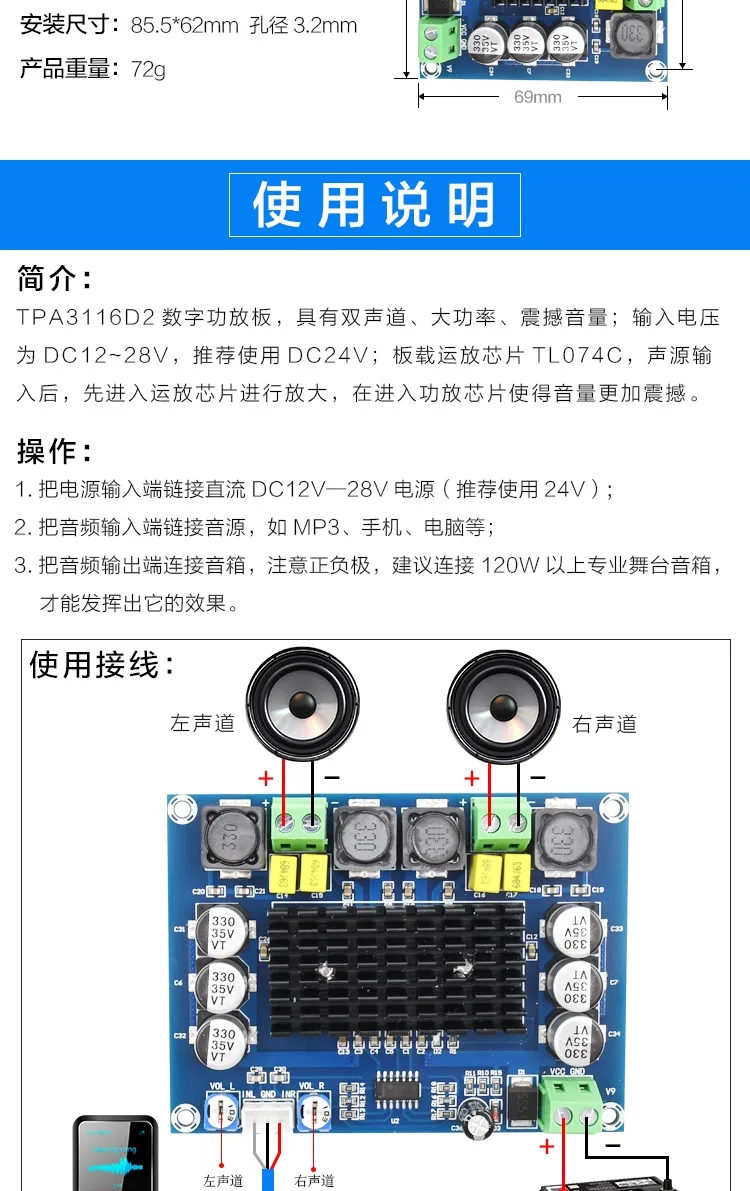 Принятие цифрового усилителя мощности чип TPA3116D2 колледж класса D run, интегрирует CSR8635.4 Версия модуля bluetooth, усилитель мощности чип, который держит более 90% эффективности мощности и низкой потери характеристик отдыха, расширенная конфигурация системы модуляции, расширенная конфигурация системы модуляции, улучшенная в градусах уменьшенная количество компонентов, Интегрирован с защитной схемой, включая перенапряжение, понижение напряжения, перегрев, тестирование постоянного тока и защиту от короткого замыкания, термостойкую улучшенную инкапсуляцию, передачу bluetooth около 10 метров, не нужно использовать окружающую среду, расстояние передачи отличается, если динамики DIY, лучше не использовать сигнал bluetooth с материалом защитного эффекта.