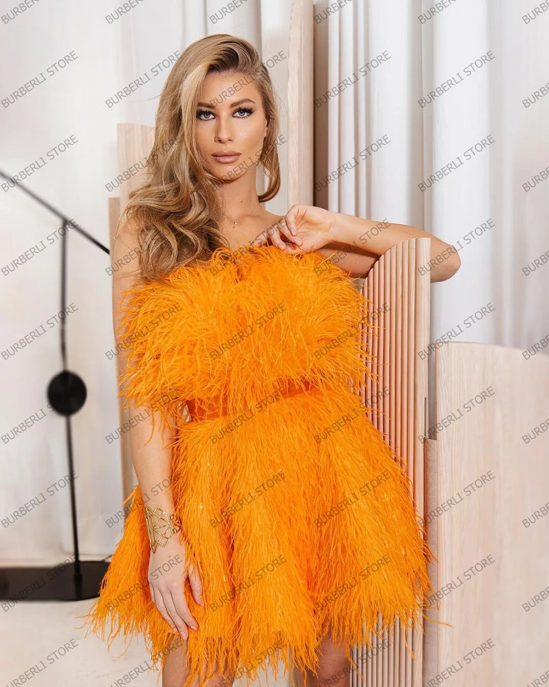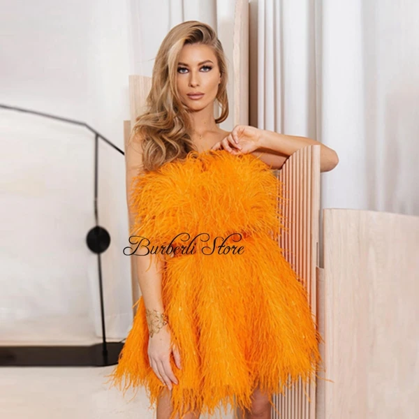 Женское короткое платье с перьями, оранжевое платье-мини без бретелек, роскошное платье для торжественных мероприятий, на Рождество