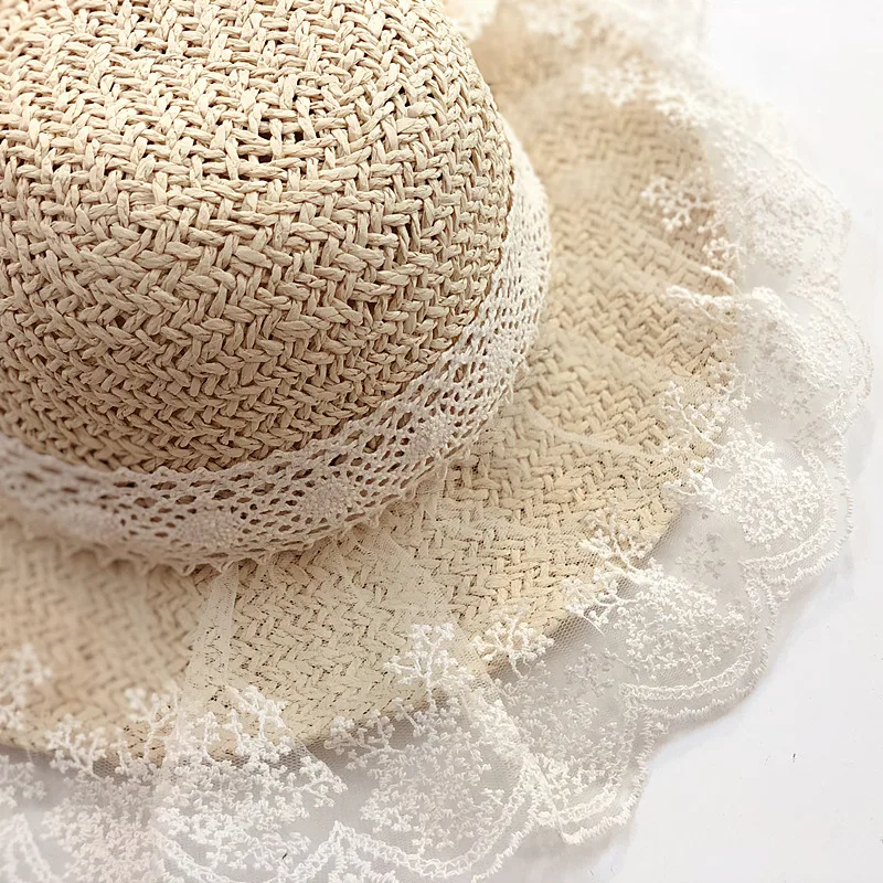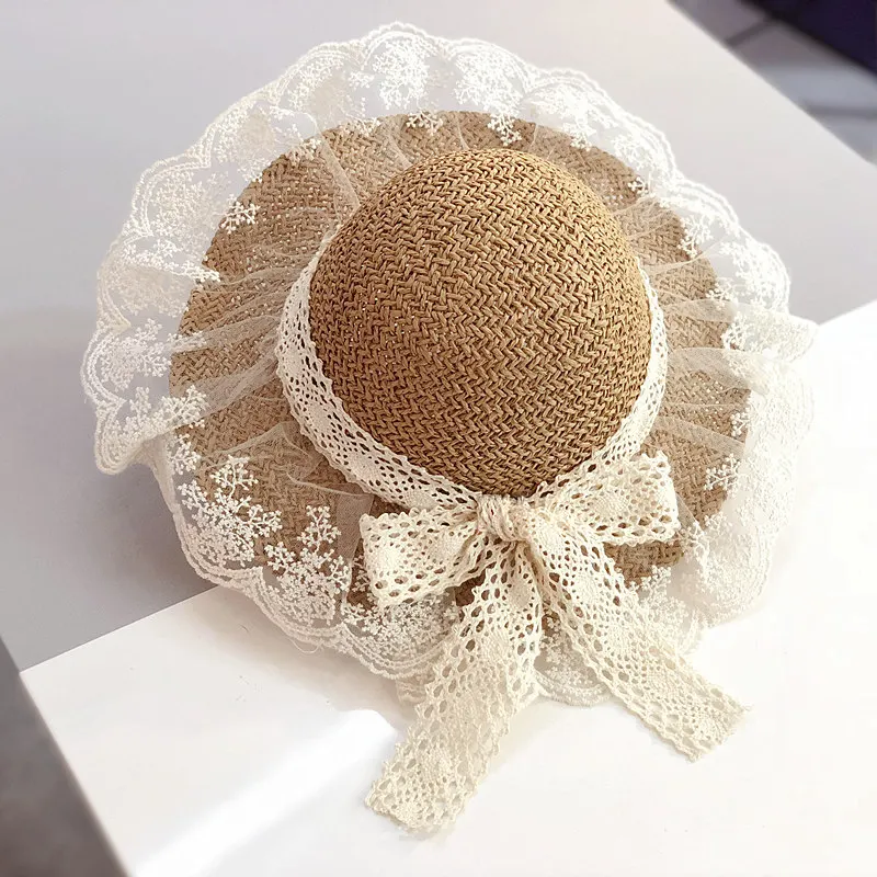 Шляпа детская соломенная с бантом, дышащая пляжная шапка от солнца, с кружевом, с широкими полями, для девочек, дорожная, летняя