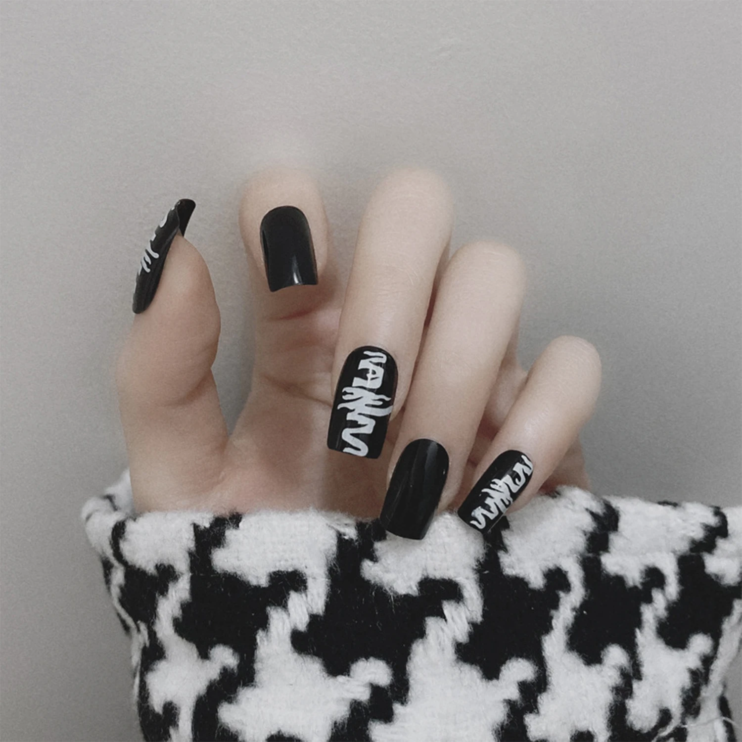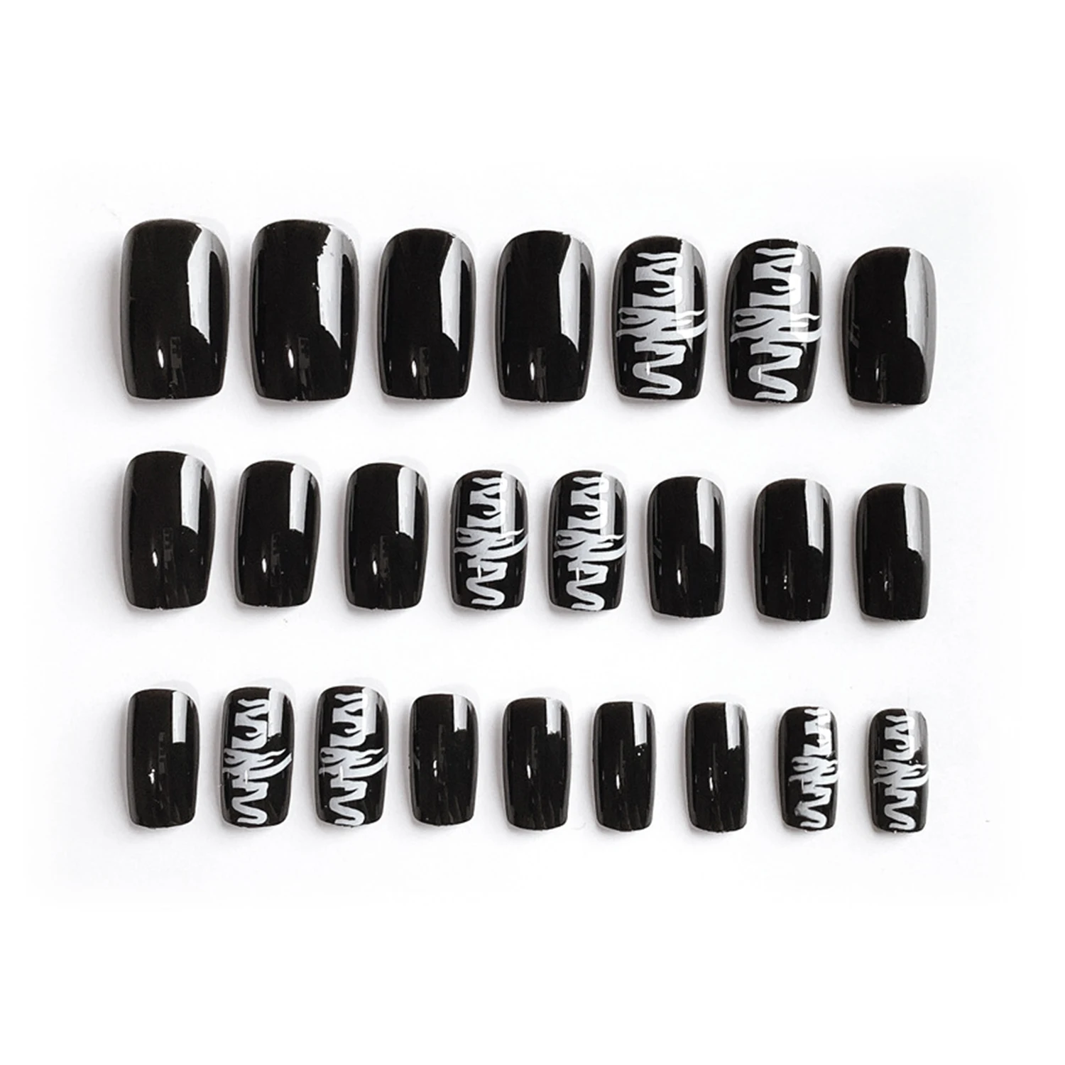 Накладные ногти средней длины, черные, квадратные, 24 шт., с рисунк...
