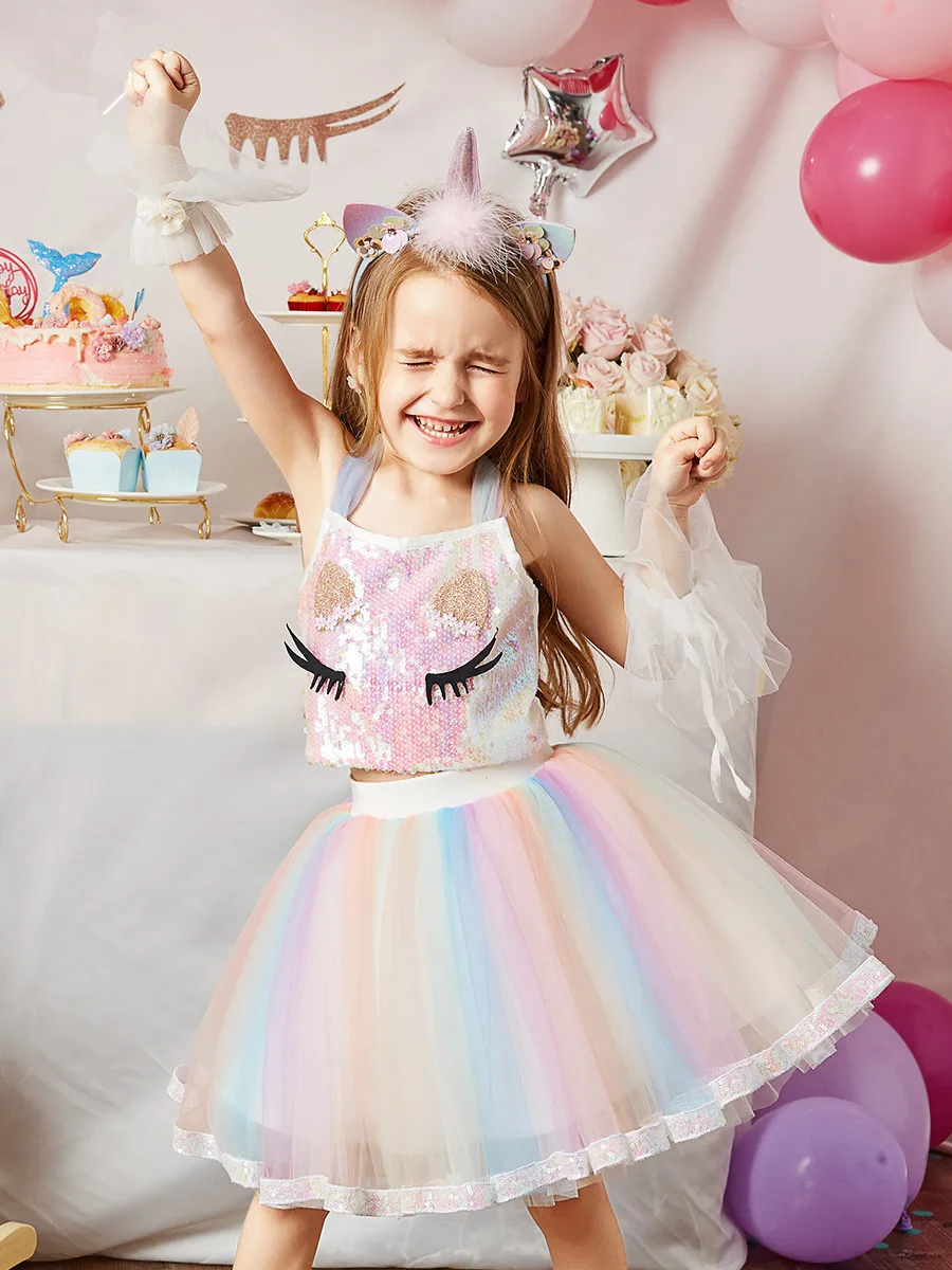 Детская одежда, Новинка весна-лето 2021, топ для девочек с единорогом и блестками и Радужная сетчатая юбка, милый костюм из двух предметов, платье для маленьких девочек