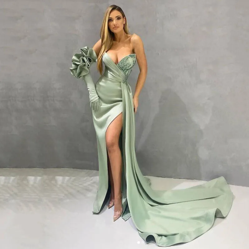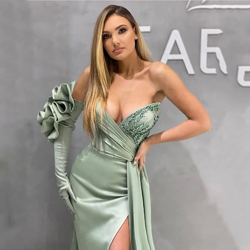 UZN зеленое вечернее платье русалки Стиль высоким бортом Разделение выпускного вечера вечерние, с низким вырезом на спине и одна перчатка Дубай Платья знаменитостей
