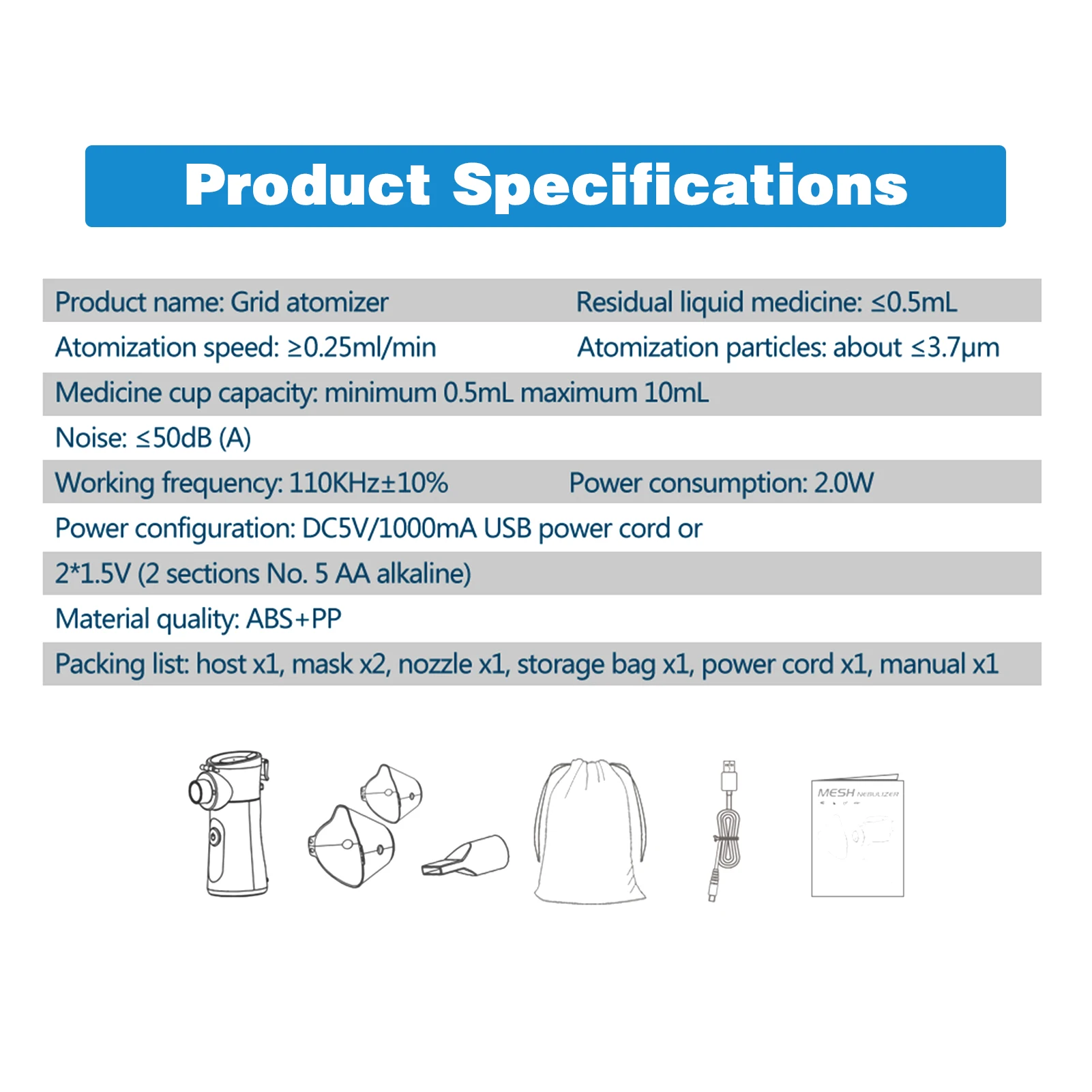 Портативный микропористый небулайзер для детей и взрослых, простой в эксплуатации и использовании. Может создавать мелкий туман для лучшего впитывания. Сверхнизкий уровень шума и портативный размер, легко носить с собой, подходит для дома, офиса или путешествий. Особенности: Высокая эффективность и меньше остатков, мелкий туман может проникать глубоко в вашу дыхательную систему естественным образом. Качественный абс + полипропилен, безопасный и надежный, длительный срок службы. Сверхтихий при работе, ≤ 50 дБ звук. Идеальный продукт для домашней ингаляционной терапии. Подходит как для детей, так и для взрослых. Оснащен маской для взрослых, детской маской и всасывающей насадкой для удовлетворения различных потребностей. Два режима питания, вы можете напрямую подключить его к USB-устройствам, чтобы использовать или установить 2 батарейки типа АА (не входят в комплект). Управление одной кнопкой, простота использования и переноски. Характеристики: Цвет: синий, серый (по желанию) Материал: АБС + ПП Источник питания: D C 5 В или 2 батарейки AA (не входят в комплект) Скорость Распыления: ≥ 0,25 мл/мин Мощность: 2 Вт Медицинская температура: ≤ 50 ℃ Рабочий звук: ≤ 50 дБ Объем: мин. 0,5 мл, макс. 8 мл Аэрозольные частицы: ≤ 3,7 мкм Автоматическое отключение: Автоматическое отключение через 20 минут работы Посылка: 140*110*60 мм/5,51*4,33 * 2.36in Вес посылка: 239 г/8,43 унции Упаковочный лист: 1 * небулайзер 2 * маска 1 * сопло 1 * шнур питания 1 * сумка для хранения 1 * Руководство пользователя