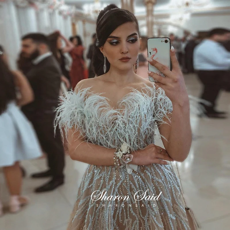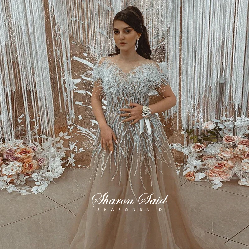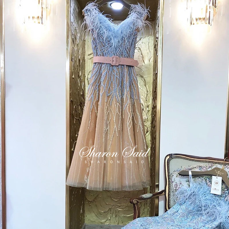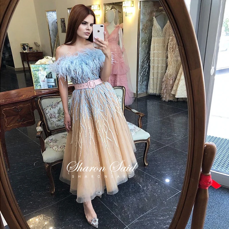 Элегантное женское вечернее платье средней длины в арабском стиле, Роскошные вечерние платья с перьями из Дубая для свадьбы, торжественных гостей, Золотое Чайное платье для выпускного вечера, 2021