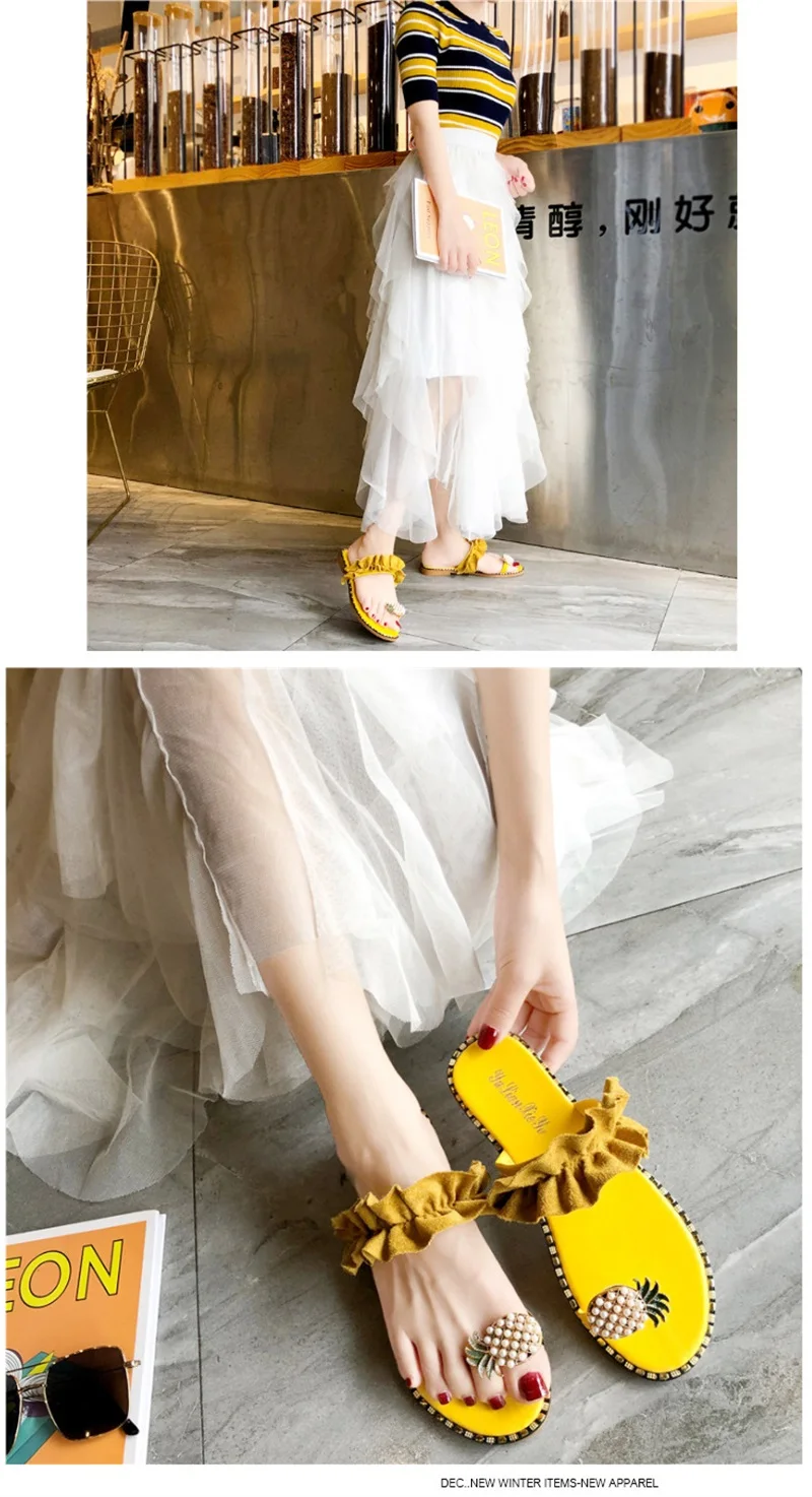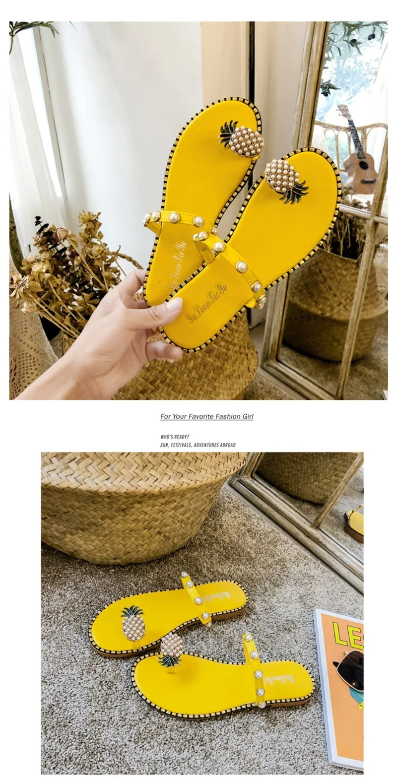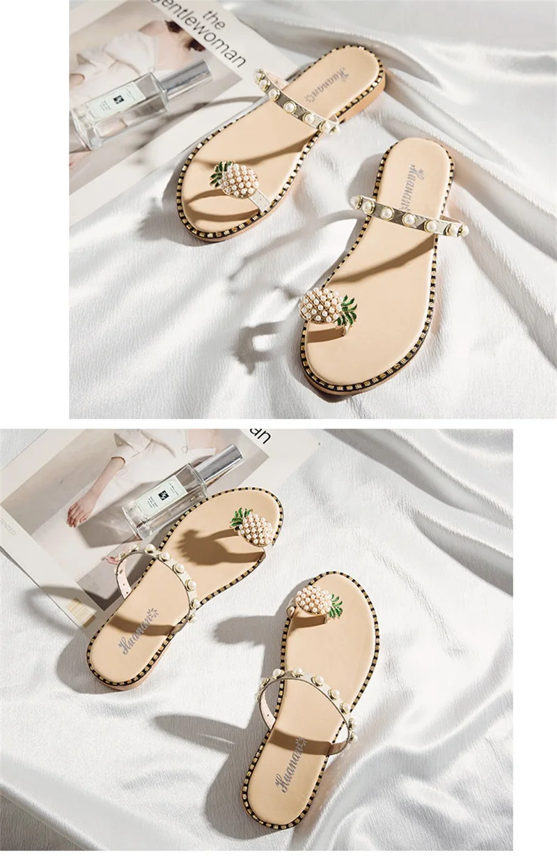 Женские сандалии с ананасами, пляжные шлепанцы, без застежки, с жемчугом, на плоской подошве, Повседневные тапочки, Размеры 35-43, лето 2021