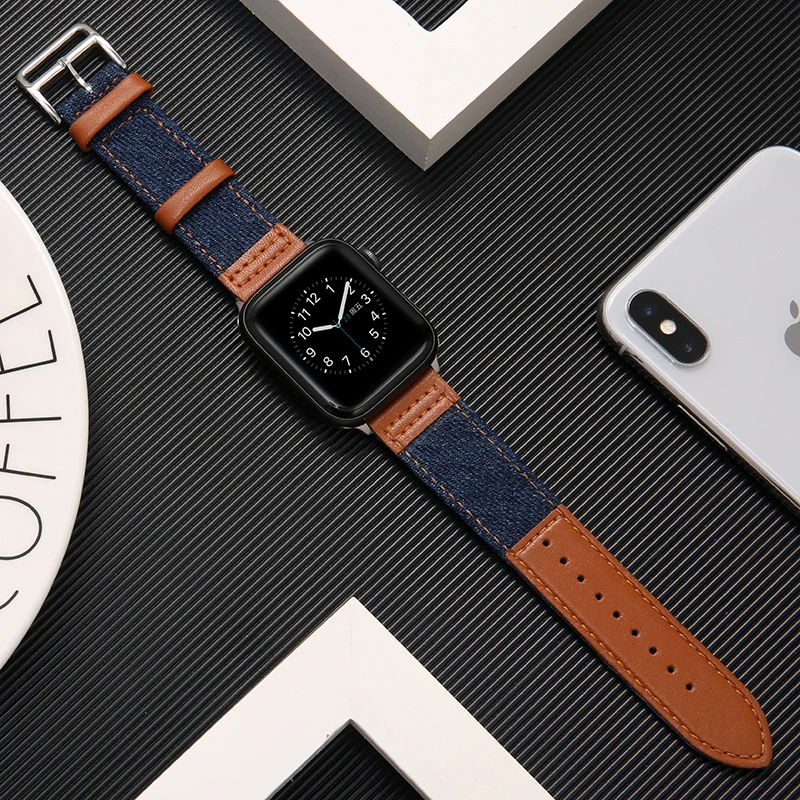 Ремешок из ковбойской ткани и натуральной кожи для apple watch band...