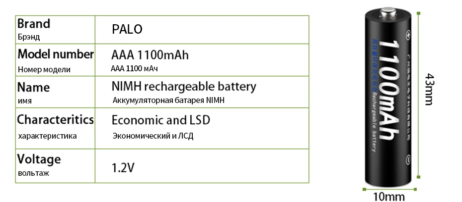 Аккумуляторная батарея PALO NI-MH AAA, 1,2 в, 1100 мАч, 3 А, оригин...
