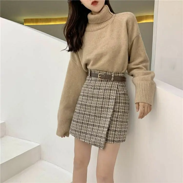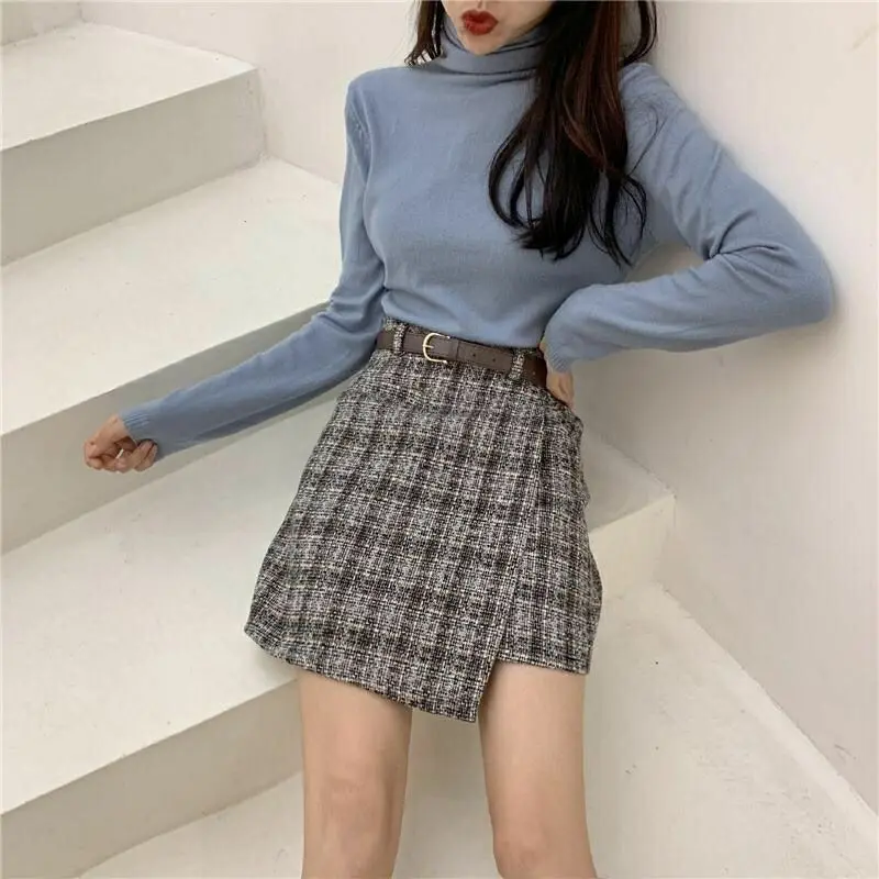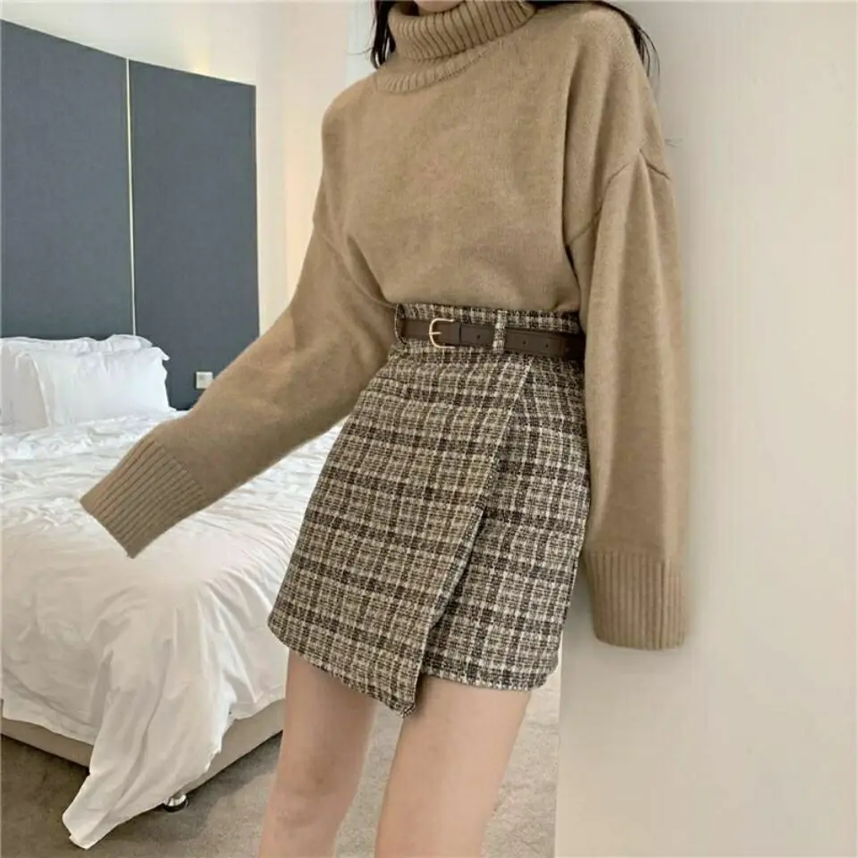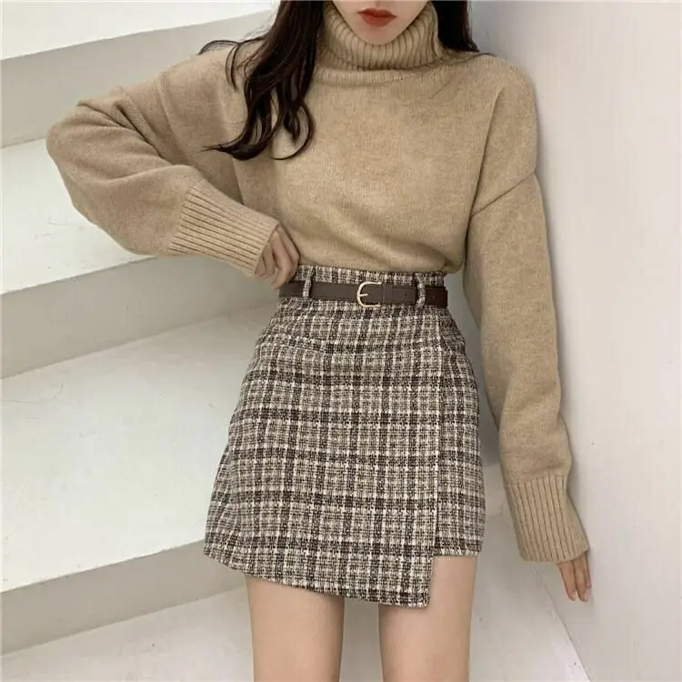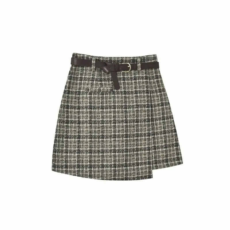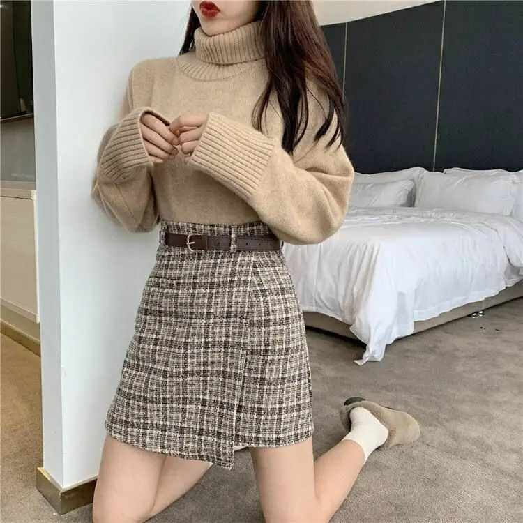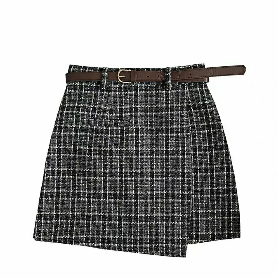 Женская юбка с высокой талией, трапециевидная мини-юбка, винтажная Повседневная клетчатая юбка с поясом, в Корейском стиле, осень 2021