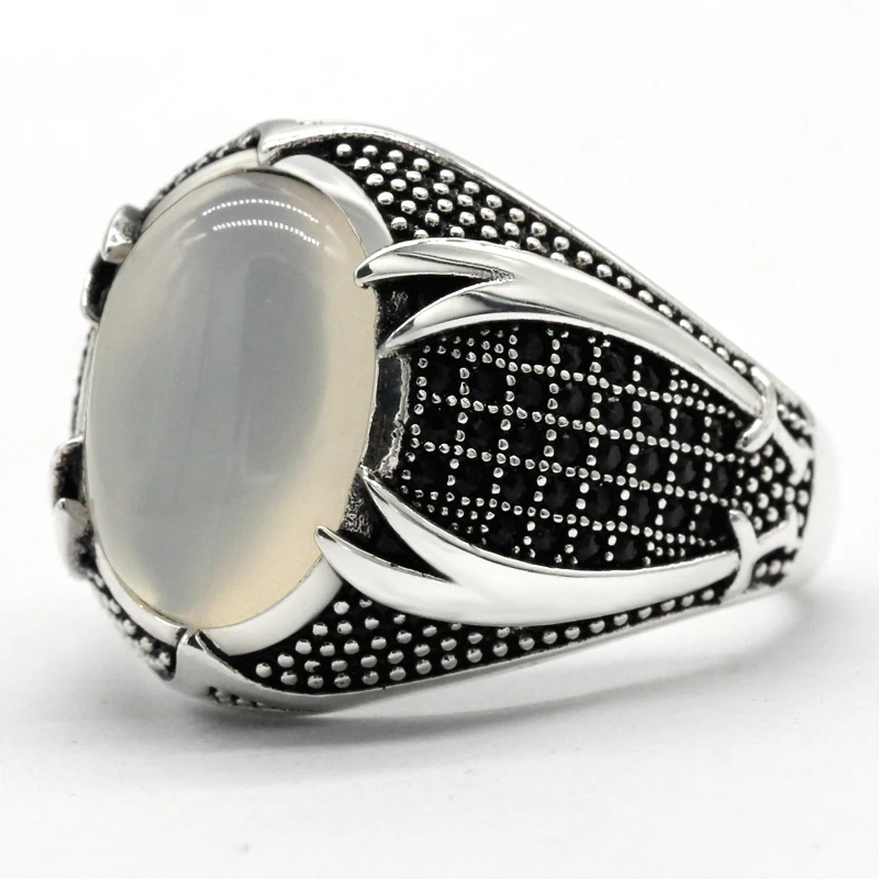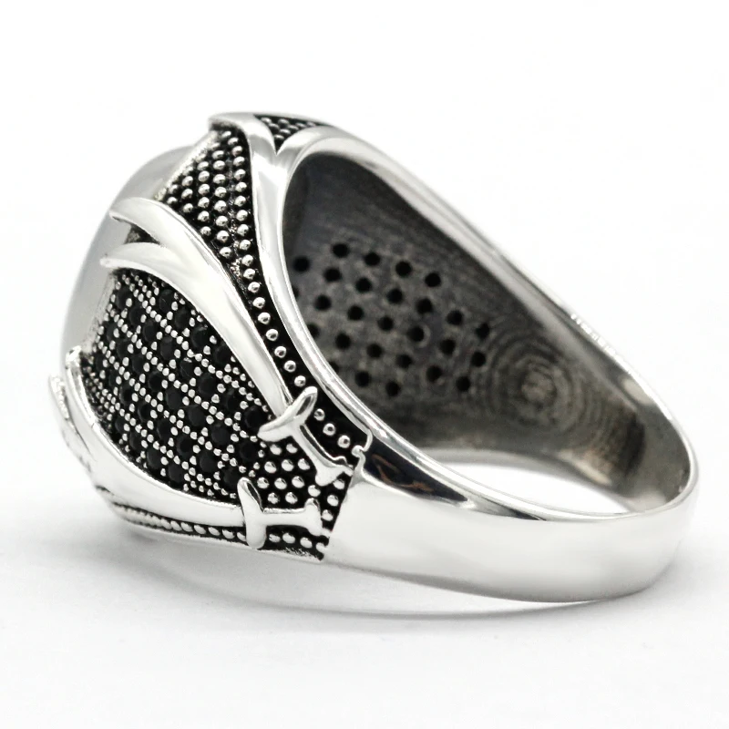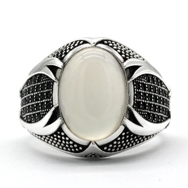 Исламское мужское кольцо, 925 пробы серебро, натуральный белый агат, с черным фианитом, двойные мечи, мусульманские кольца, религиозная Подарочная бижутерия