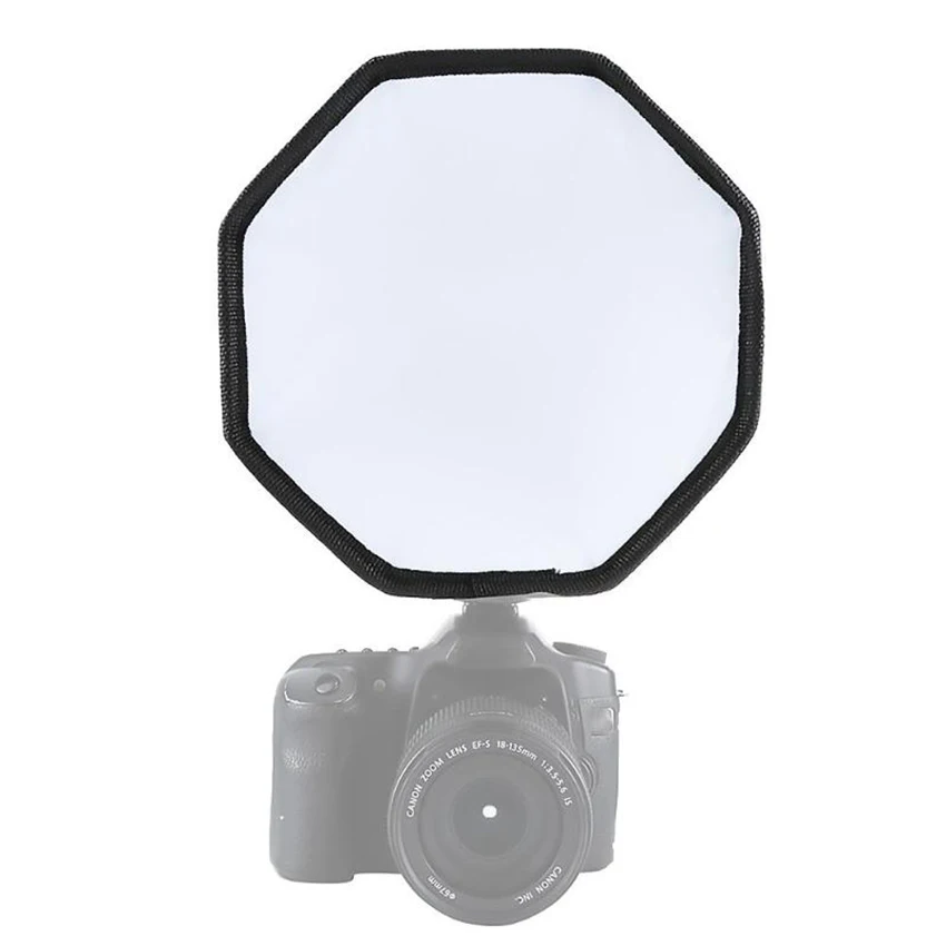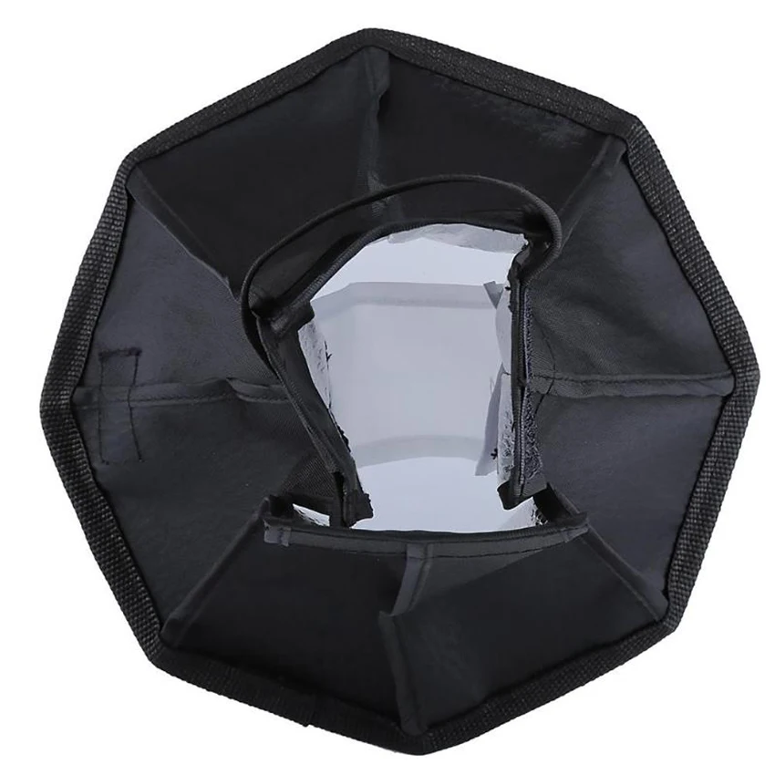 Восьмиугольный диффузор в верхней части камеры изготовлен из высококачественной зернистой светоотражающей ткани и мягкой ткани. Есть два слоя мягсветильник кой ткани, с хорошим мягким световым эффектом и точной цветовой температурой. Универсальный порт на липучке подходит для всех накамерных вспышек. Крепежный карман на липучке имеет противоскользящие линии, чтобы предотвратить его падение во время использования.