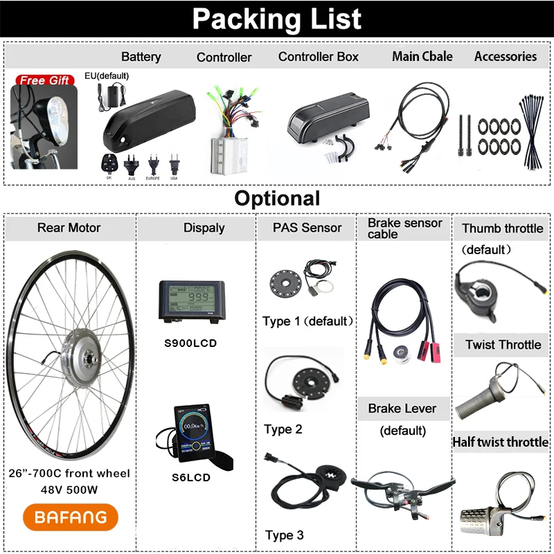 Этот комплект поставляется со всем, что вам нужно для преобразования вашего велосипеда в электрический велосипед, включая аккумулятор и зарядное устройство. Вот список упаковок:(1) 1 * мотор-колесоBAFANG 48v 500w переднее мотор для центрального движения колесаРазмер обода: 26 ", 700C(28")(2) 1 * Аккумулятор Hailong48v 10ah литиевая батарея48v 13ah литиевая батарея48v 20ah samsung литиевая батарея(3) 1 * литиевая батарея (европейский стандарт)Примечание: Если вы не Европейский, мы добавим вилку для преобразования(4) 1 * Датчик скорости и датчик дисковой пластины (PAS)(5) 1 * дисплей (S900 или S6 LCD)(6) 1 * Водонепроницаемый основной кабель(7) 2 * выключатель тормоза/Датчик тормоза(8) 1 * дроссельная заслонка (дроссельная заслонка большого пальца или половина закрутки или закрутка дроссельной заслонки)(9) 1 * контроллер(10)1 * блок контроллера(11)1 * головной светильник(12) другие аксессуары