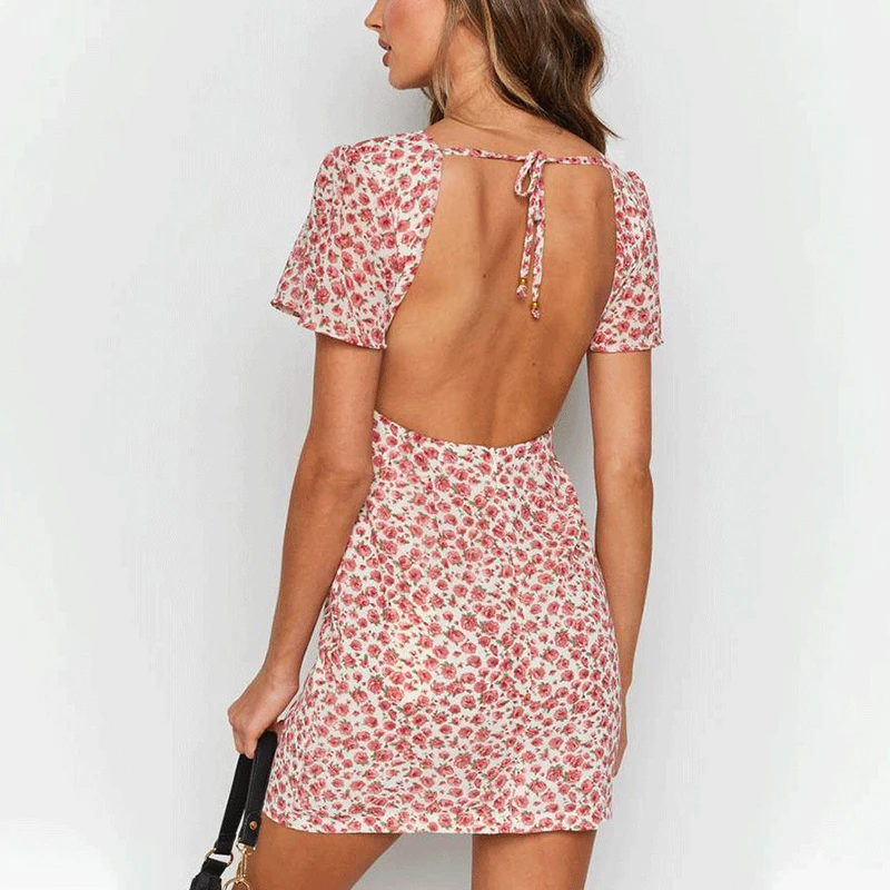 Женское платье с цветочным принтом, v-образным вырезом и открытой спиной, повседневное летнее пляжное платье с коротким рукавом, женские вечерние мини-платья с высокой талией