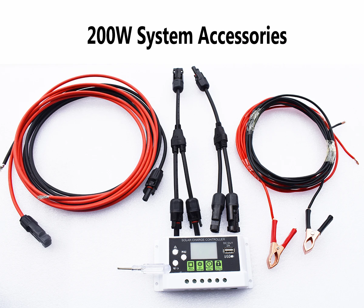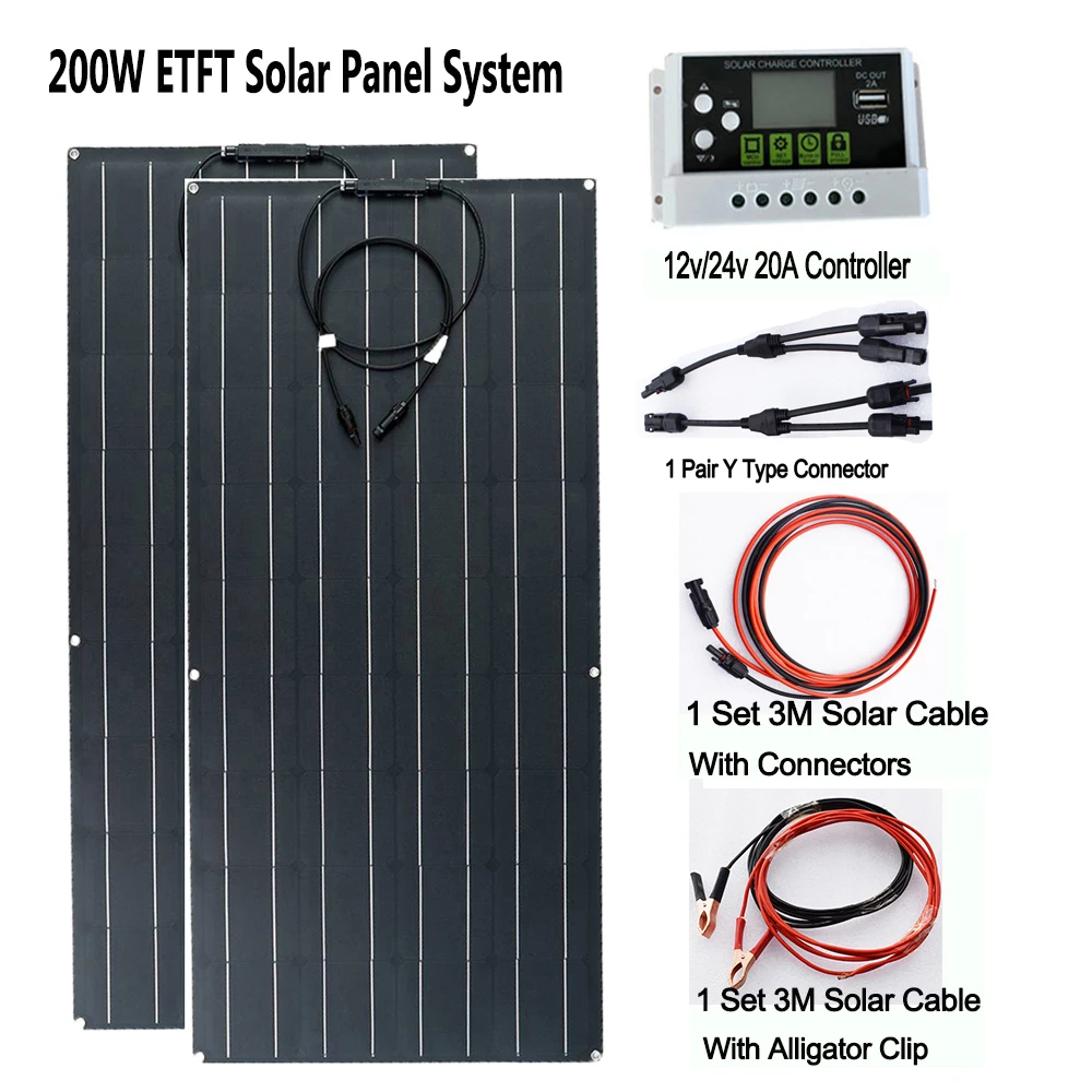 200W Панели солнечные Системы: из 2 предметов 100 Вт гибкие Панели солнечные, 1 * 20A блок управления установкой на солнечной батарее, 1 набор 3 м кабель с Connectors.1set 3 м Солнечный Кабель с защищенный зажим «крокодил». 1 пара коннекторов Типа Y.