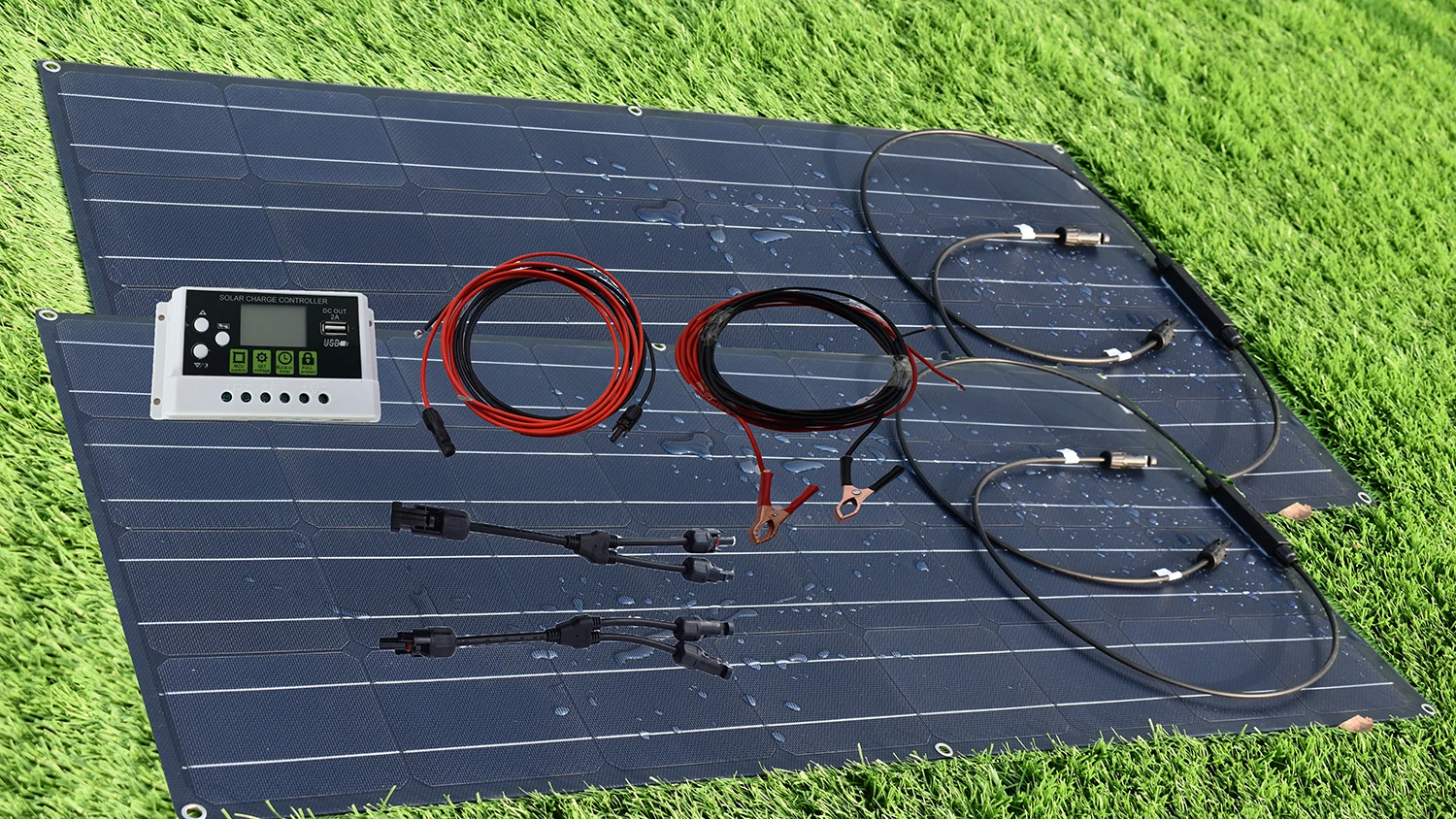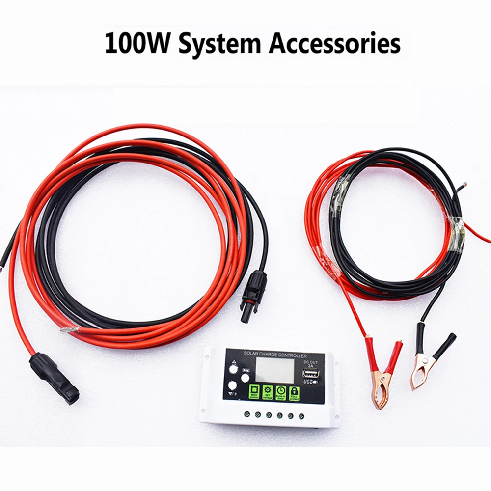100 Вт Солнечная система; 100 Вт Гибкая солнечная панель, 1*10 А Солнечный контроллер, 1 комплект 3 м кабель с разъемами.