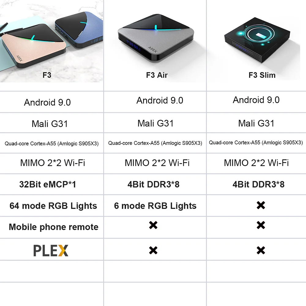 -CPU: четырехъядерный процессор Amlogic S905X3 ARM Cortex A55; -GPU: ARM Mali-G31MP; -ОС: Android 9,0; -Память: DDR3 2 ГБ/4 ГБ, флэш-памяти 16/32/64 ГБ -Поддержка H.265, 8K @ 24fps, 4K @ 60fps, HD 2,1, USB3.0; -Поддержка 10/100M Ethernet, 2,4 и 5G двухъядерный процессор Wi-Fi; -Поддержка: изменяемый RGB светильник, сменные обои; -Поддержка: Youtube HD 4K; -Поддержка беспроводного обновления (OTA). -Есть три варианта A95X F3 Air: A: 2G + 16G +2,4G Wifi+ BT4.2 + 100 м B: 4G + 32G +2,4G/5G двойной Wifi+ BT4.2 + 100 м C: 4G + 64G +2,4G/5G двойной Wifi+ BT4.2 + 100 м Пожалуйста, неOte: Для клиентов в России мы отправимРусская клавиатура, И другие регионы отправятАнглийская клавиатураПо умолчанию Без литиевой батареи С 3-цветной подсветкой.