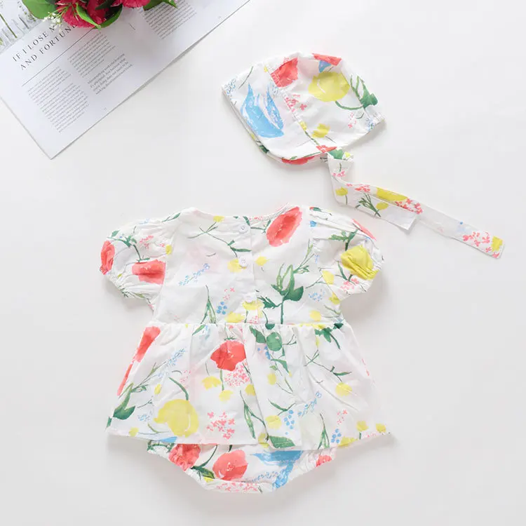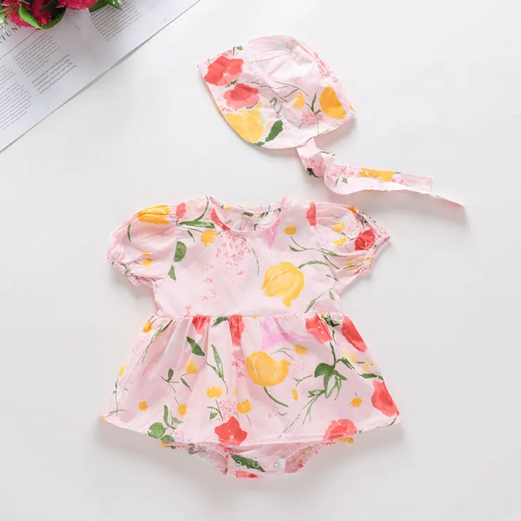Коллекция 2021 года, летняя одежда для маленьких девочек боди с короткими рукавами и цветочным принтом для маленьких девочек + шапочка, одежда для малышей от 0 до 2 лет