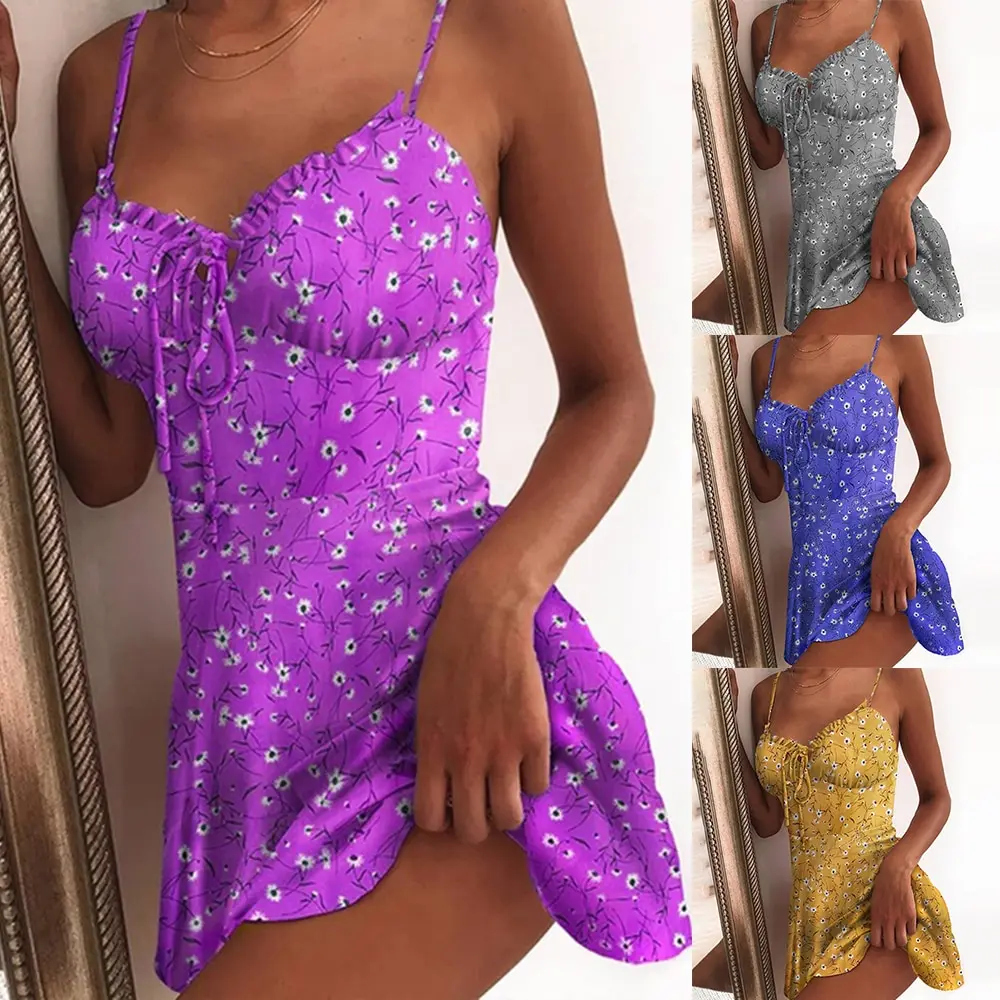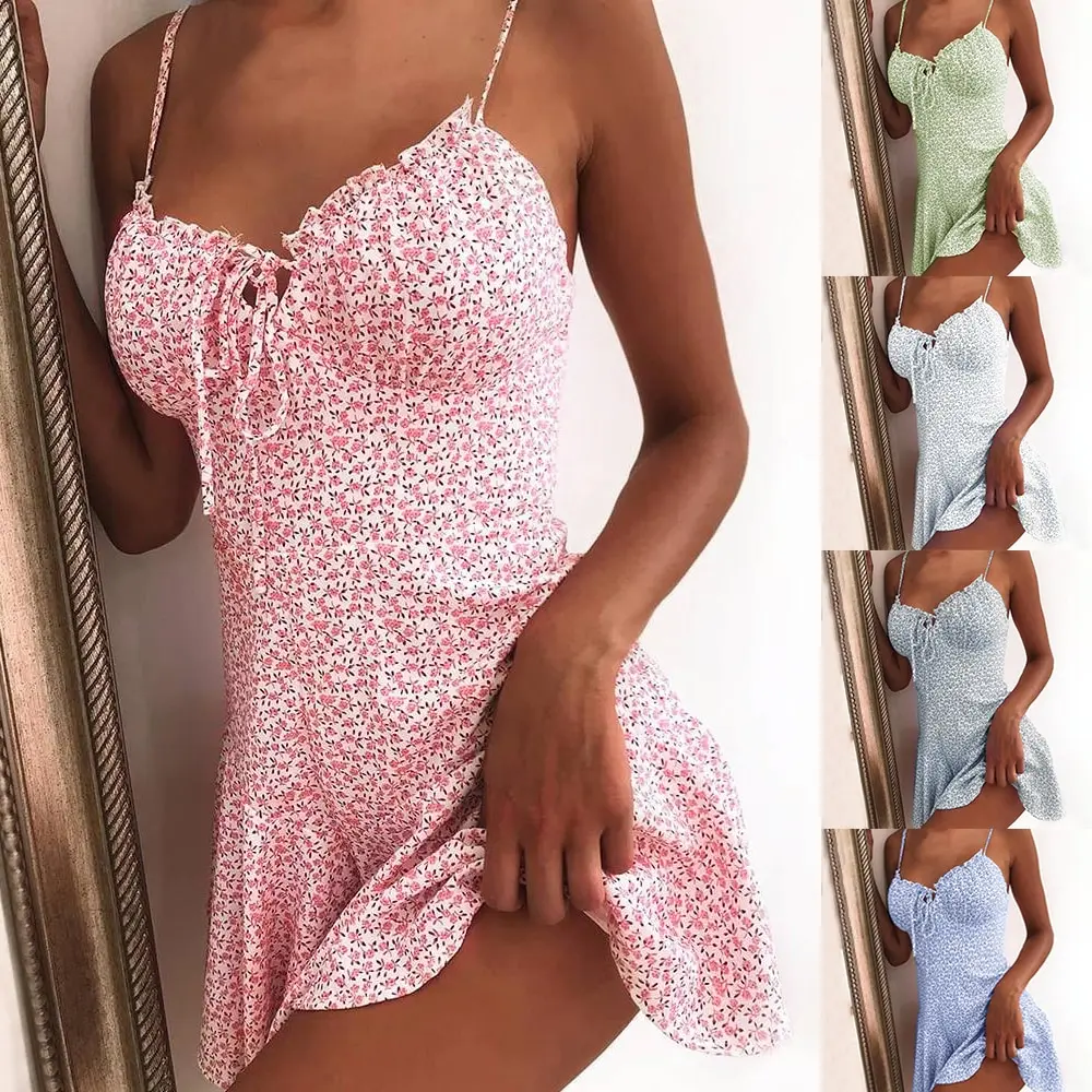 Женское платье с V-образным вырезом, пикантное вечервечерние-платье-трапеция с цветочным принтом, с оборками на плечах, с открытой спиной, короткое платье до колен, на лето