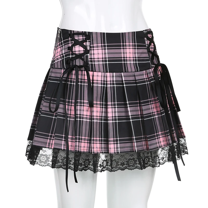 Женская юбка на шнуровке ALLUKASA Y2K, розовая клетчатая плиссирова...