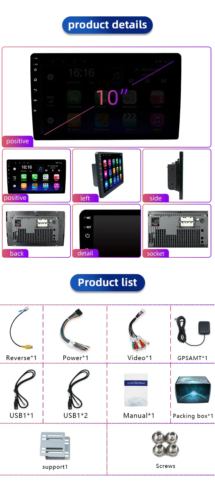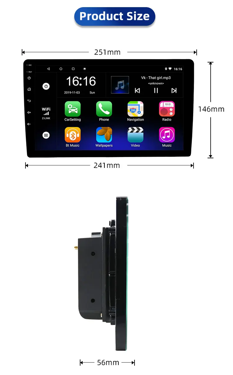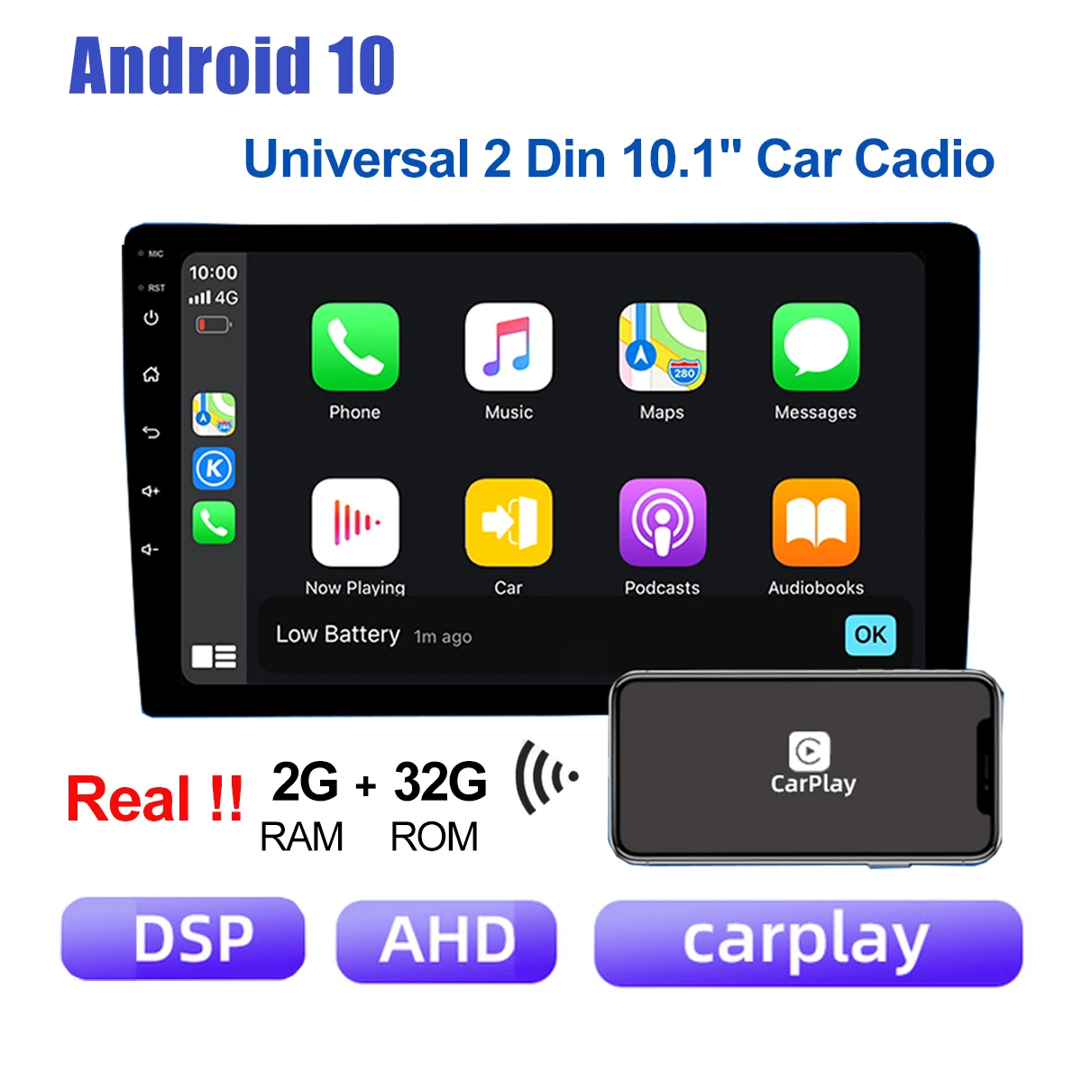 Экран:10,1-дюймовый сенсорный экран, тренд, мода, Полная сенсорная кнопка, устойчивым к царапинам, износостойкий, 1024*600 разрешениеСпециальная функция:1. Он может поддерживать управление рулем2, поддержка 1080P Поддержка музыки без потерь3, поддержка камеры, встроенный микрофон4. Поддержка бесконтактной работы5. Поддержка Google online map навигация6. Поддержка эквалайзера для регулировки звука, чтобы показать лучшие результаты7, поддержка онлайн-видео, фильмов, музыки, радио, Youtube, Yahoo, MSN...8, fm-радио заставит вас поднять настроение во время путешествия.9, зеркальные ссылки для iPhone и Android10. Поддержка CarPlay + AUTO + DSP + AHDХарактеристики:Питание: DC 12V (пособие диапазон: 10,8-14,5 V)Макс. Ток: 10AРазмер экрана: 10,1 дюймовОперационная система: Android 10ЦП: четырехъядерныйROM: 32 ГБОЗУ: 2 ГбРасширенный USB: Поддержка usb-диска до 32 ГбСенсорный экран: ДаWiFi: встроенный WiFi модем, поддержка 802.11b/g/nЗапись: MP3, WMAПосылка включает:1 х Автомобильный MP51 x GPS кабель2 x USB кабель1 х Кабель питания1 кабель RCA1 x входной кабель камеры