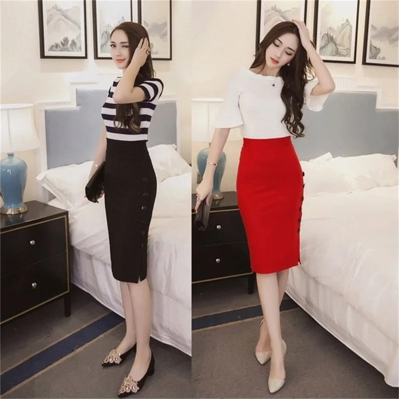 Элегантные женские винтажные офисные юбки OL с высокой талией, с пуговицами, с разрезом, юбки-карандаш для женщин, большие размеры, S-5XL, тянущиеся Юбки миди