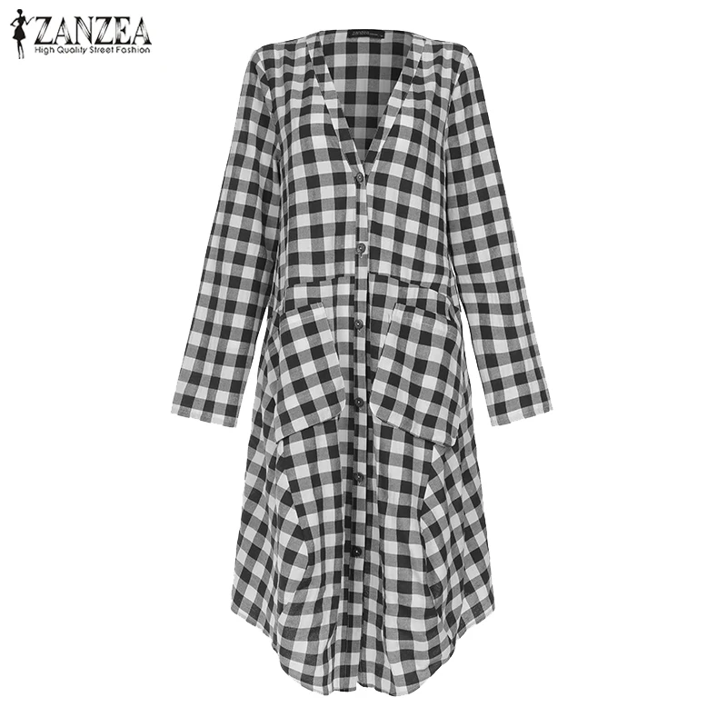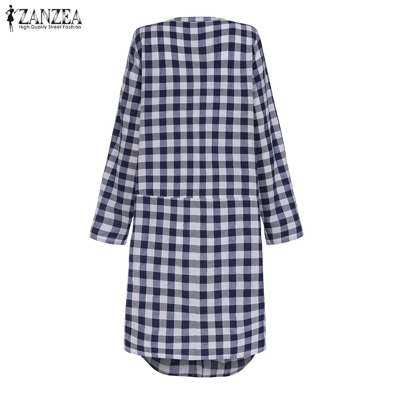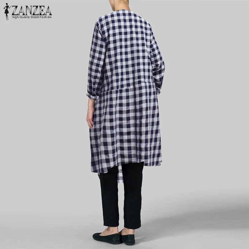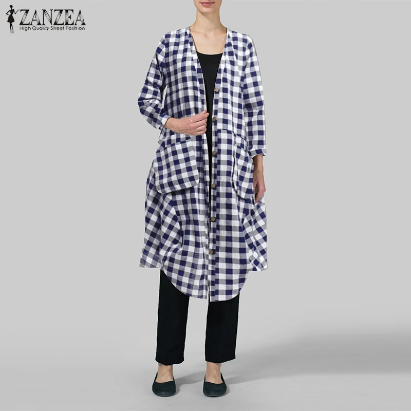 Женский модный кардиган 2021 года, топы ZANZEA, Клетчатая блуза в клетку, Женская винтажная блузка на пуговицах, повседневные длинные рубашки из хлопка и льна S-