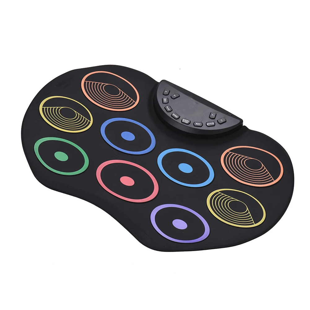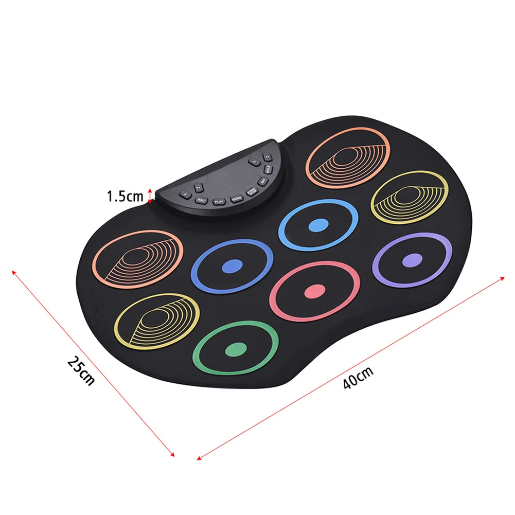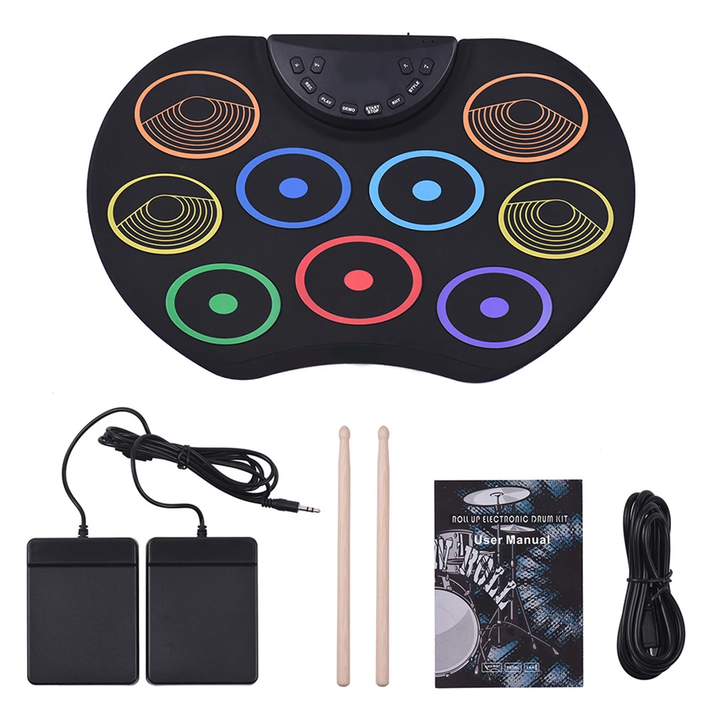 С 9 красочными барабанными колодками, включая 3 * барабан Tom, 1 * барабан snare, 1 * бас-барабан, 3 * тарелки, 1 * Hi-hat, обеспечивая отличные звуки барабана; поддерживает подключение ножной педали, чтобы сделать игру более гибкой.
