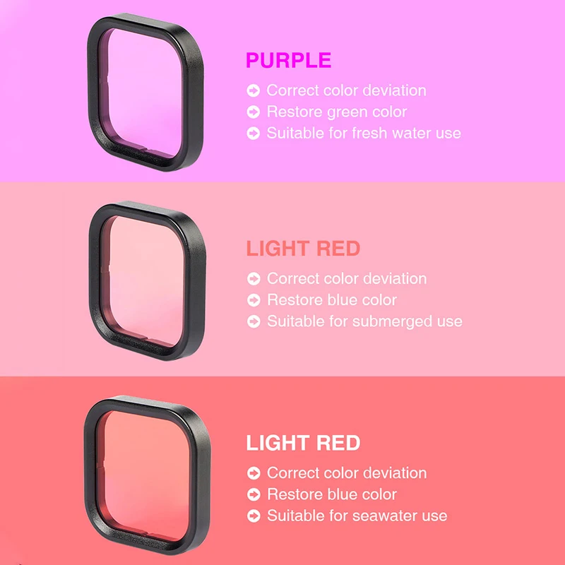 Описание: 1. Фильтр разработан специально для GoPro, используется для коррекции цвета при погружении, подходит для системы тропической воды и системы голубой воды; 2. Видео или фотография, сделанная без фильтра, слишком синяя или слишком зеленая.3. Применение его между 3,5 метров и 25 м, есть достаточное количество красный светильник в воде выше 5 метров, таким образом, не фильтр не требуется.4. Некоторые длины волны светильник не может проникать в водоемы, поэтому съемка видео под водой вызовет проблемы с бамбуковыми съемкамиХарактеристики: 1. Удобная Разборка и сборка, фильтр имеет отверстие для шнура, которое может быть связано, чтобы предотвратить потерю веревки и не потеряет фильтр; 2. Светильник с красным фильтром, корректирует отклонение цвета, восстанавливает синий цвет, подходит для дайвинга;3. Красный фильтр, восстанавливает зеленоватый цвет, подходит для съемки в морской воде; 4. Фиолетовый фильтр, восстанавливает синий цвет, подходит для съемки пресной воды.1. Красный: Красные и дымовые фильтры можно использовать около полудня (прямой солнечный свет на воде), основная цель-восстановить красный Поглощенный водой2. Фиолетовое зеркало: специально разработано для GoPro, используется для коррекции цвета при съемке горных пейзажей, подходит для зеленой морской воды в сумерках3. Светильник красного цвета в зависимости от углаСпецификацияРазмер изделия: 12.5x10.5x5cmВес одного продукта: 32 гВодонепроницаемая глубина; 45-50 мЦвет: красный + фиолетовыйМатериал: высокопрозрачный полиуретановый материал + закаленное стеклоПосылка:3 * Водонепроницаемый чехол-фильтр для объектива GoPro Hero 9 BlackТолько вышеуказанная посылка, другие товары не включены.Примечание: светильник и различные дисплеи могут привести к тому, что цвет товара на картинке немного отличается от реального. Допускается погрешность в измерениях +/- 1-3 см.