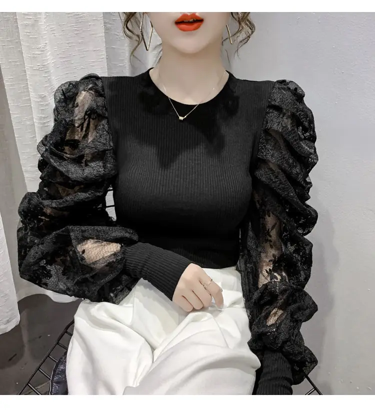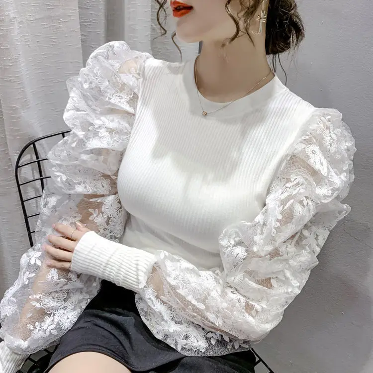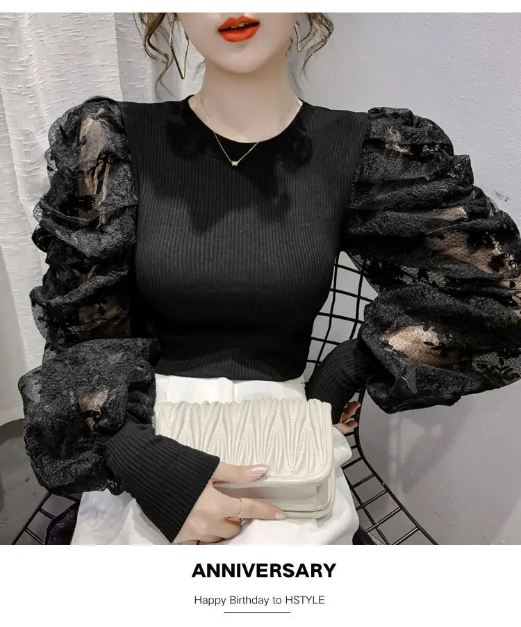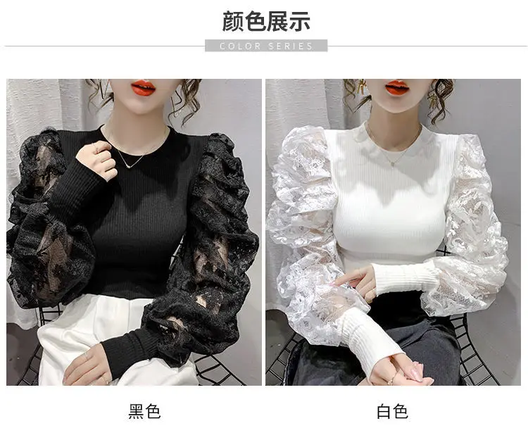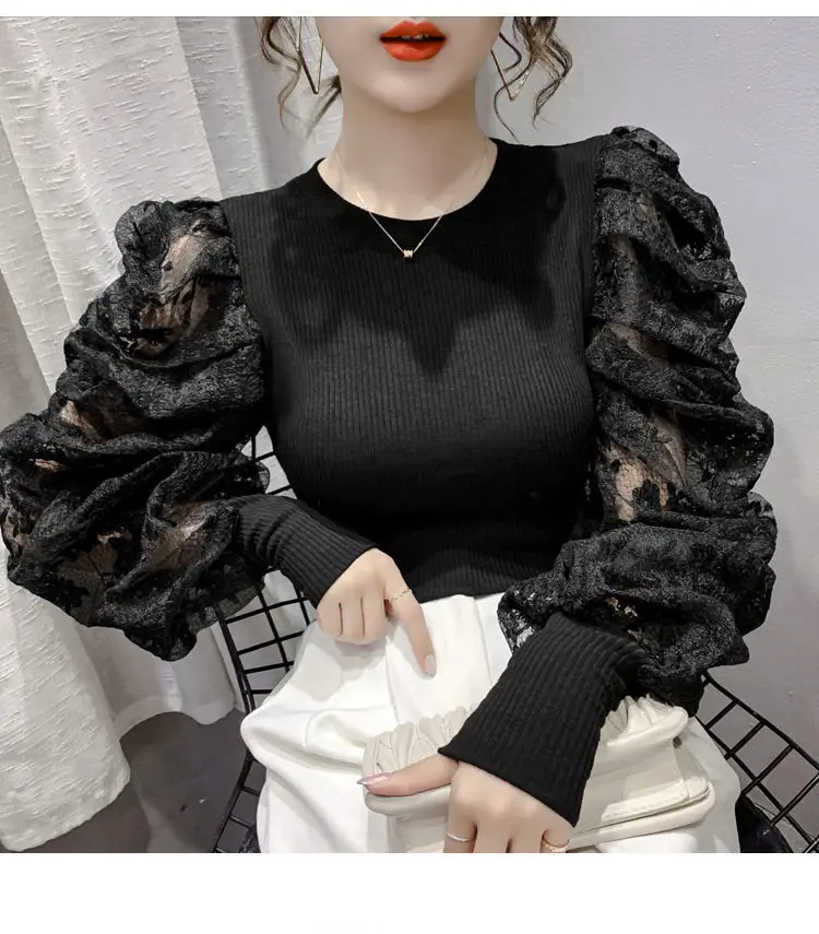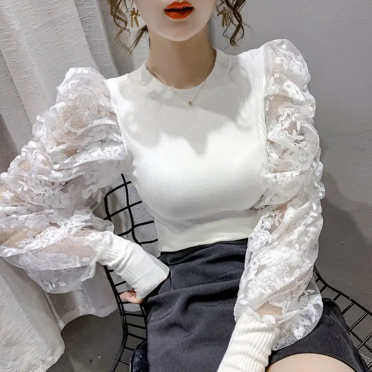2021; Сезон весна-осень; Новая Женская шею тонкий длинный рукав футболка женская с воздушными рукавами, блузы с кружевом Короткие сексуальные топы
