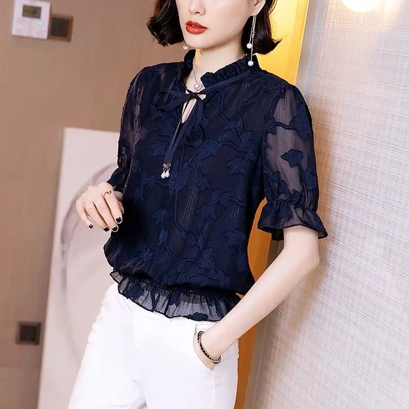 Женская кружевная вязаная рубашка, облегающая блузка с круглым выре...