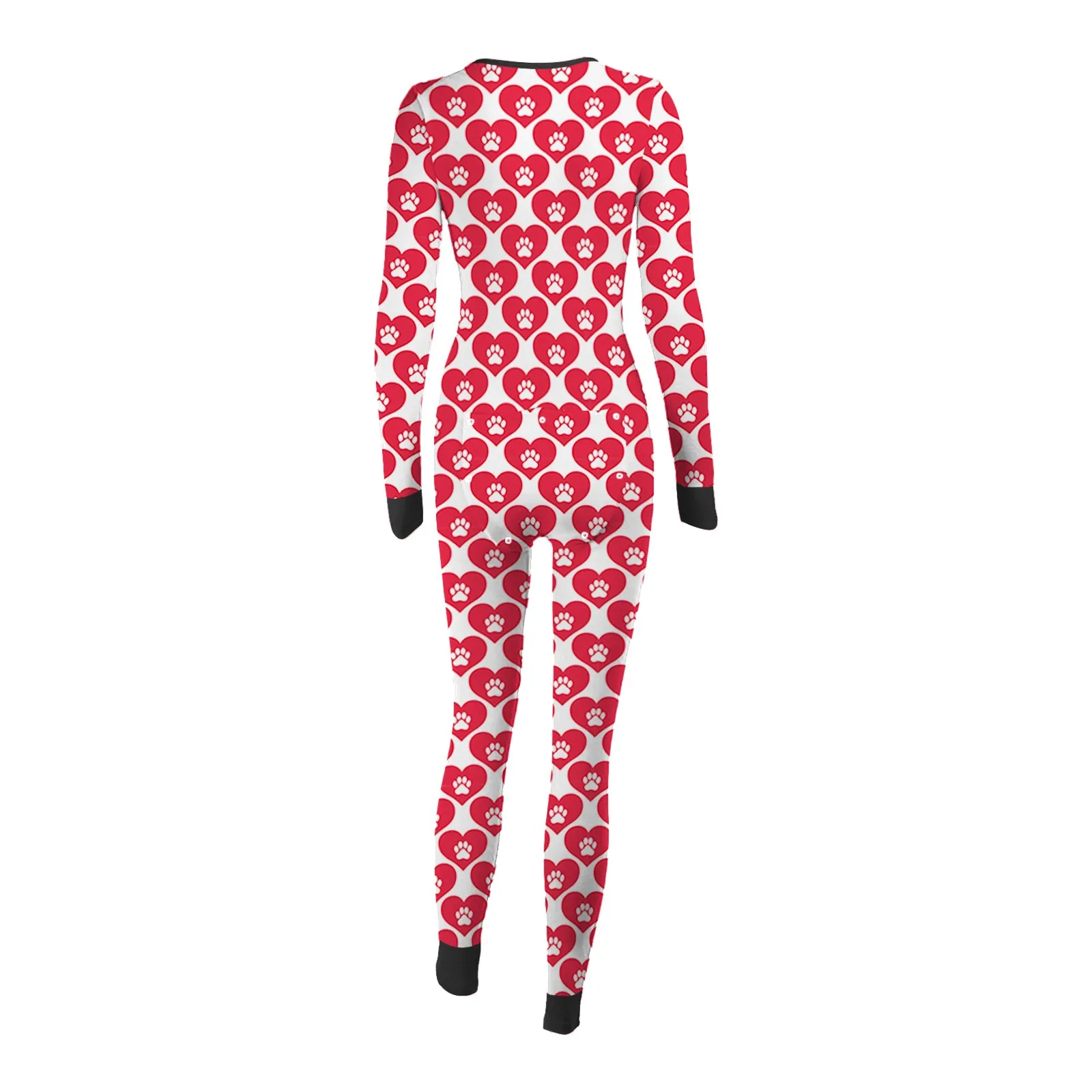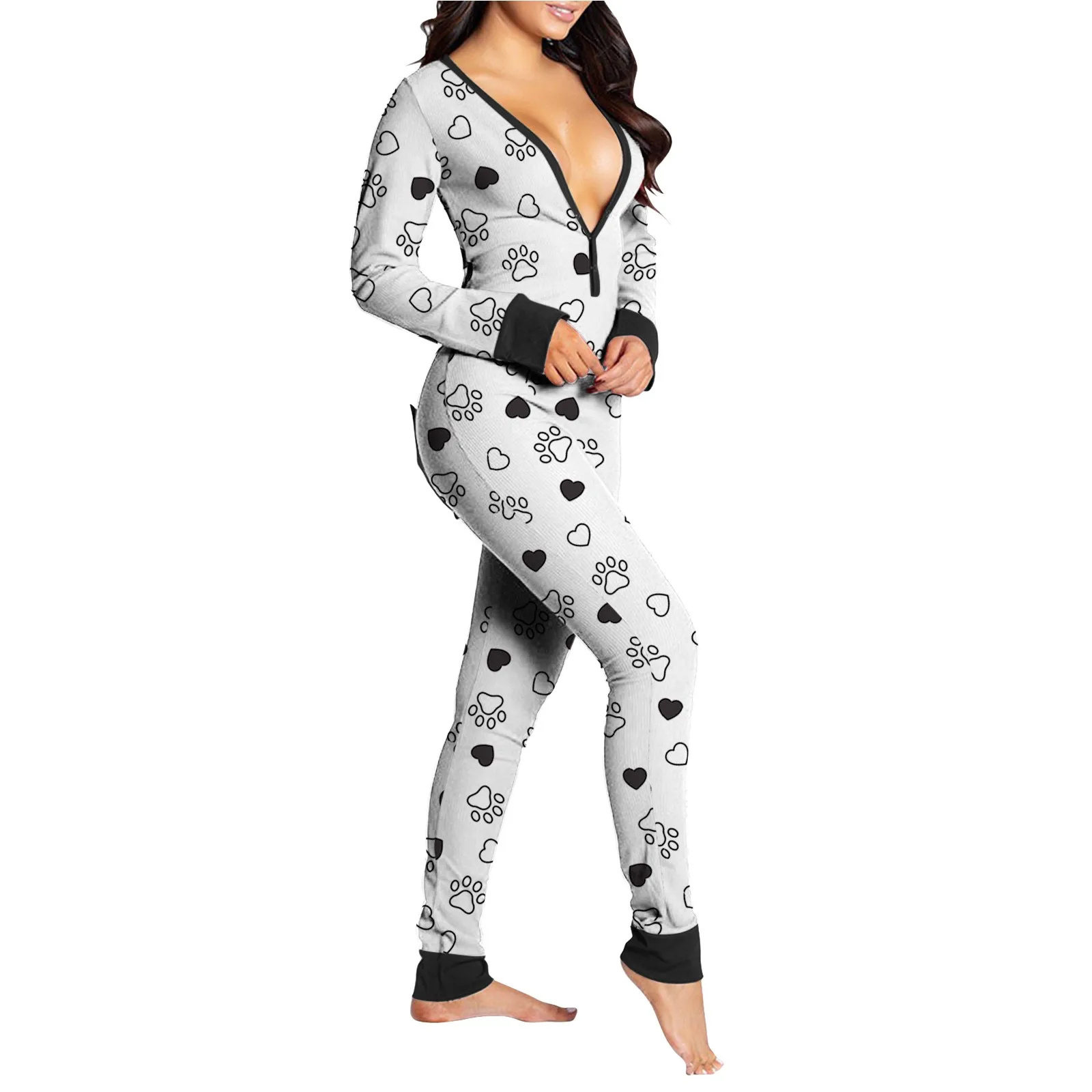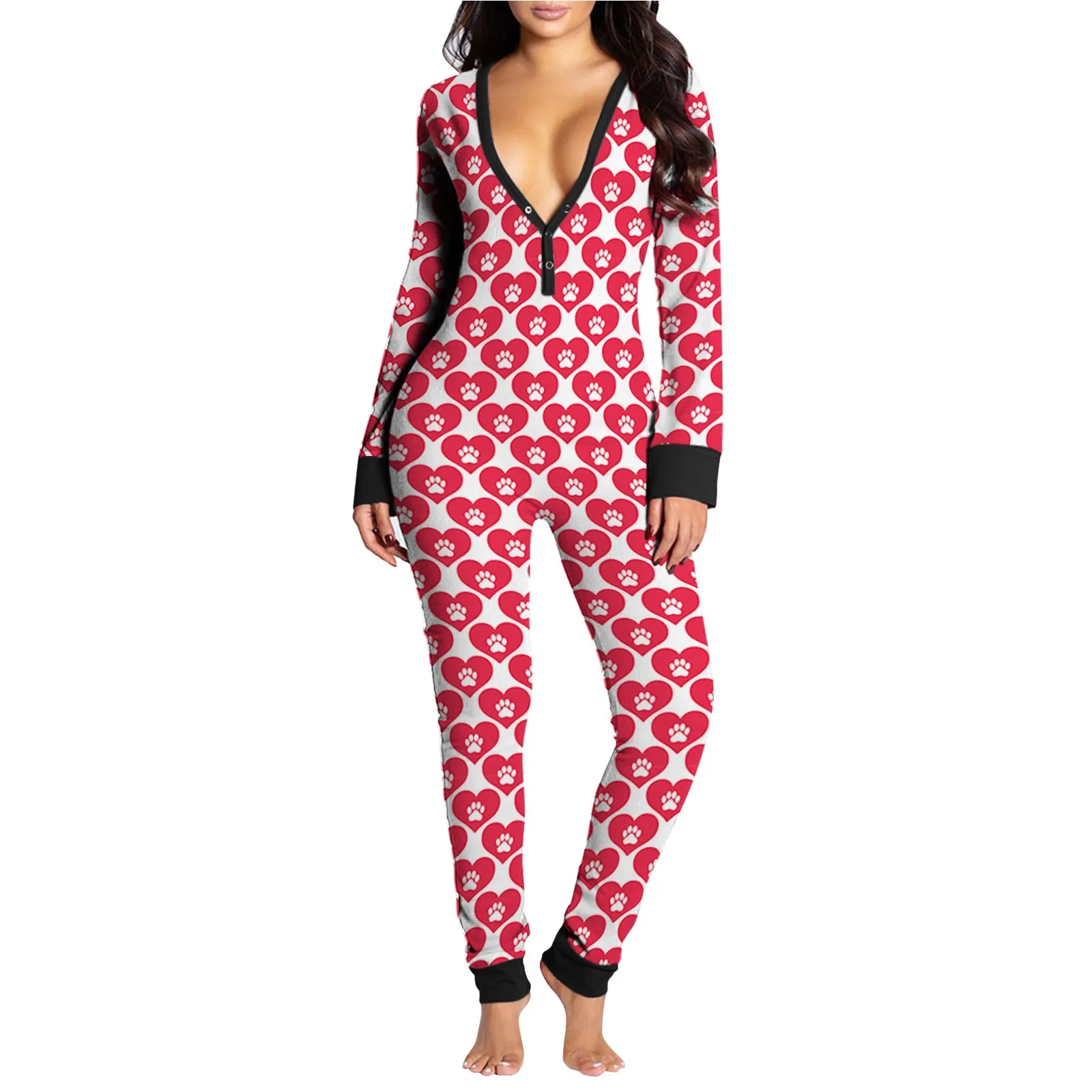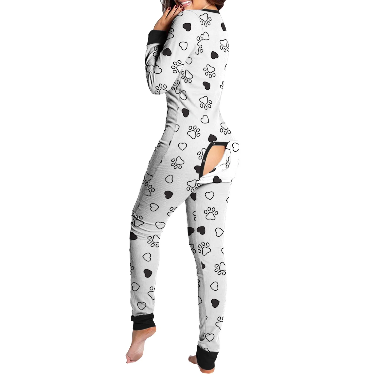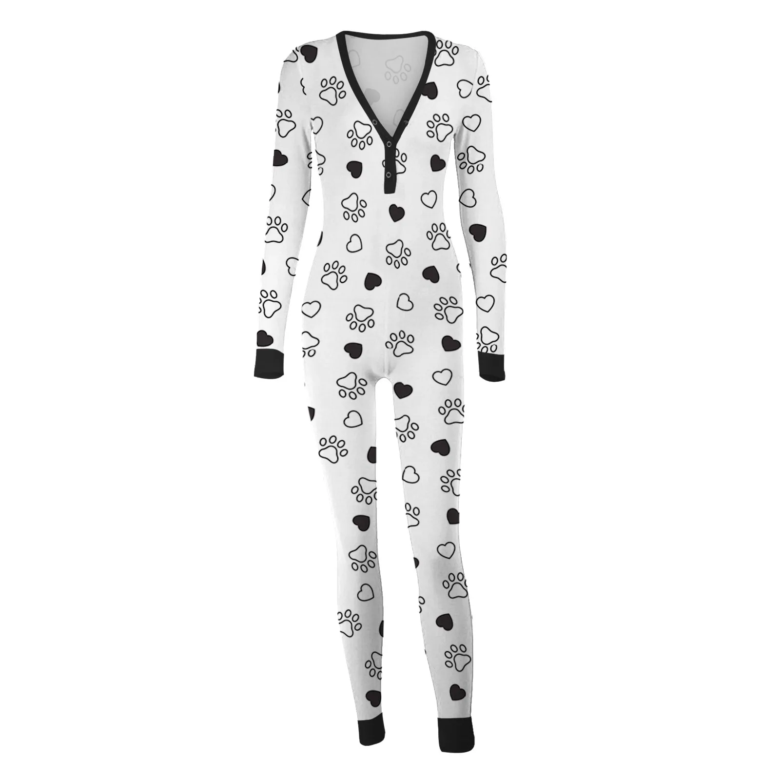 Сексуальная Женская пижама с V-образным вырезом и принтом кошачьей лапы Barboteuse, функциональная Пижама с клапаном на пуговицах для взрослых, клубный комбинезон на пуговицах