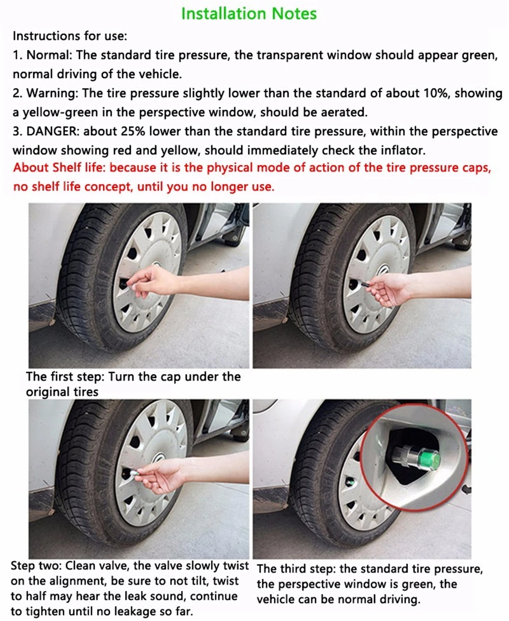 Материал: нержавеющая сталь Диапазон давления: 2,0/2,2/2.4Bar Подходит для любого стандартного размера, имеющегося штока клапана шины. Визуально оповещает вас, когда давление в шинах низкое, чтобы помочь избежать преждевременного износа шин или обдува от надутых шин.