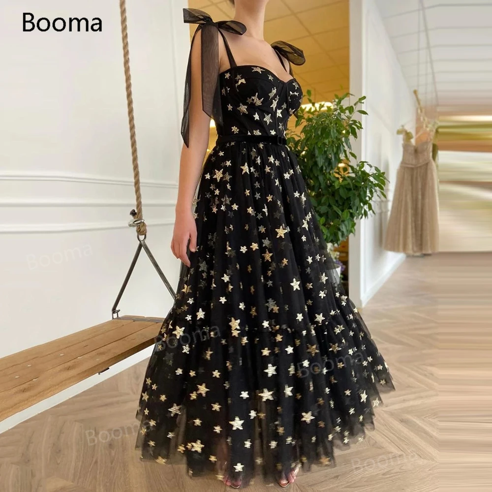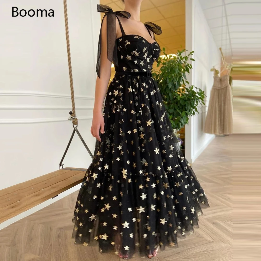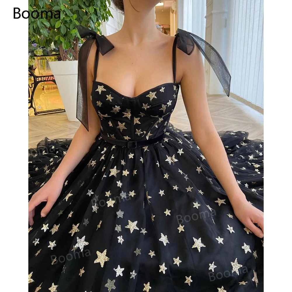 Женское Тюлевое платье с блестками Booma, черное вечернее платье-трапеция до щиколотки на бретелях с бантом, с поясом, для выпускного вечера