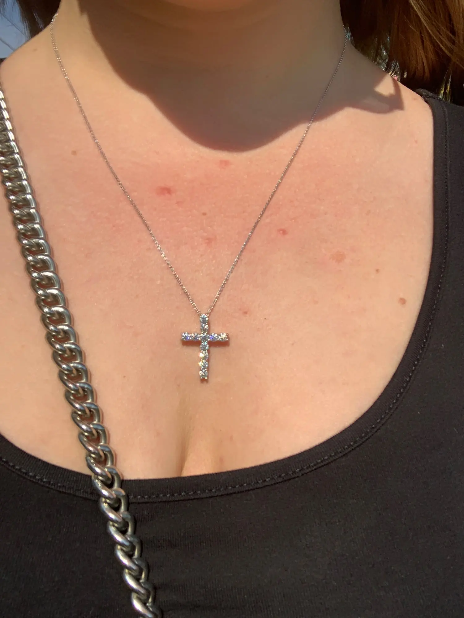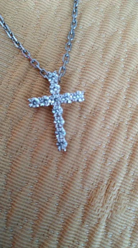 Крест серебряный 925 пробы, со сверкающими камнями. Размер одного камня 3 мм, размер самого креста около 2,5 см. Крест выглядит аккуратно, на вид совсем не маленький. Каждый камень протестирован, имеет положительный тест. Покупайте смело. Кулон подойдёт на тонкую и средней толщины цепь. Очень довольна покупкой. Хороший подарок. Доставка около трёх недель. Спасибо.