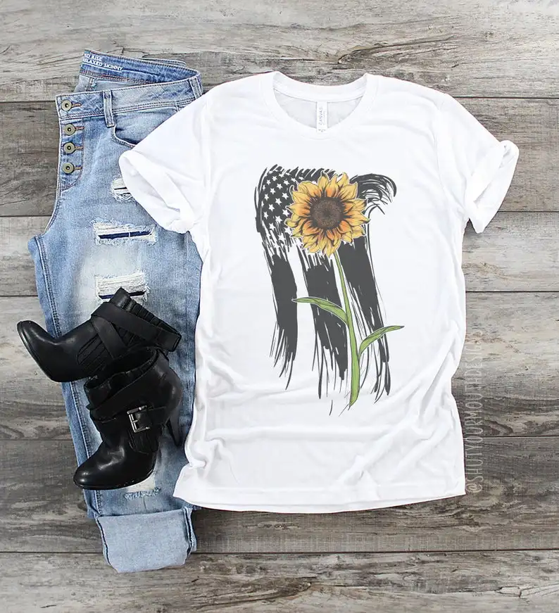 Футболка женская хлопковая с принтом подсолнухов и круглым вырезом