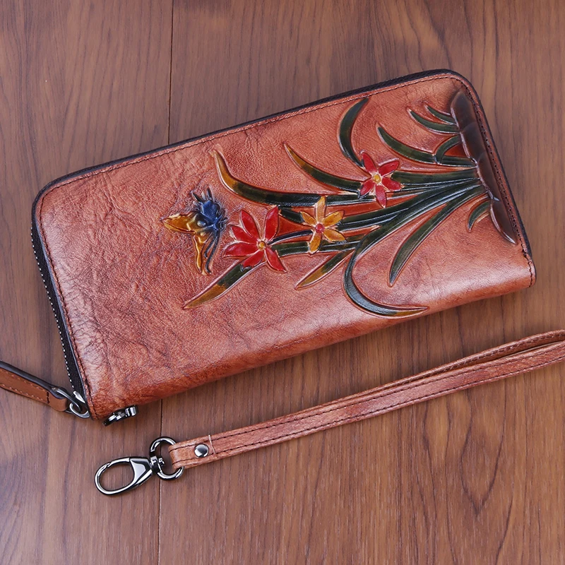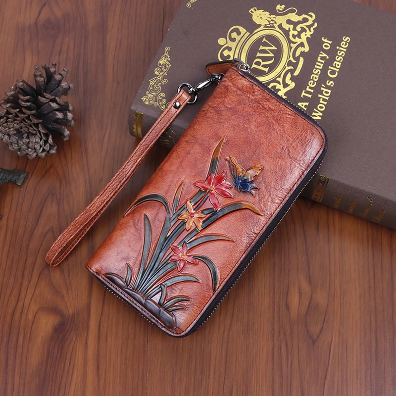 Женский Длинный кошелек-клатч из натуральной кожи, дамская сумочка с принтом бабочки и цветов, Дамский ретро-кошелек с застежкой для карт, сумочка для денег и запястья