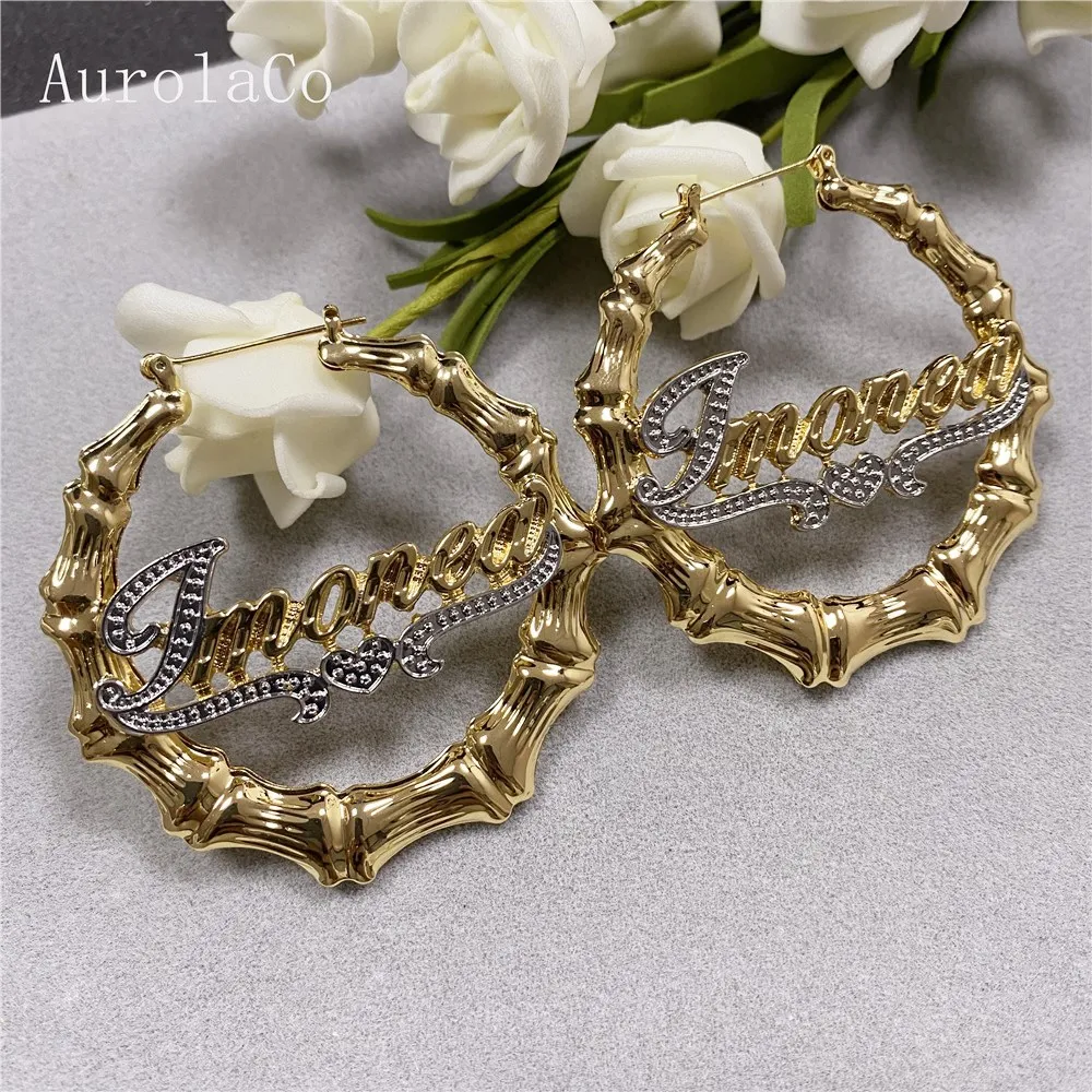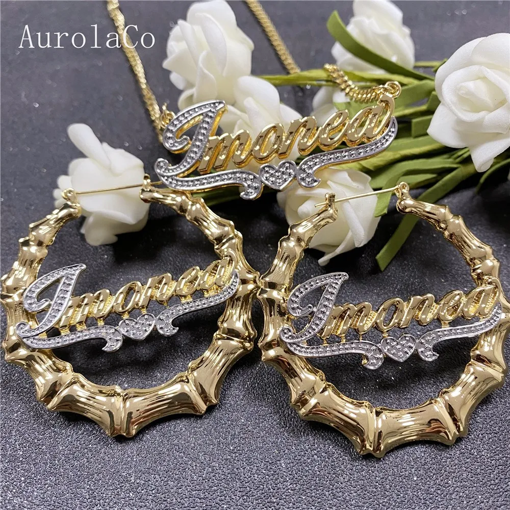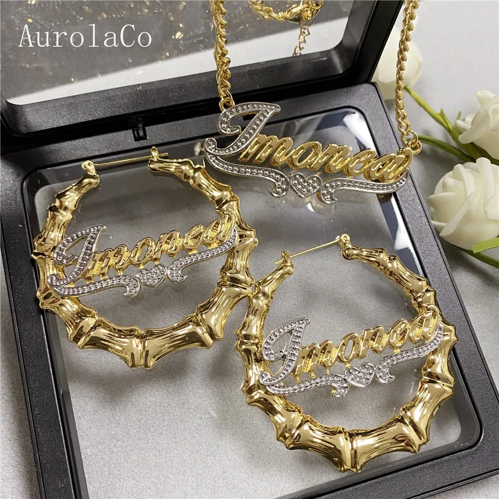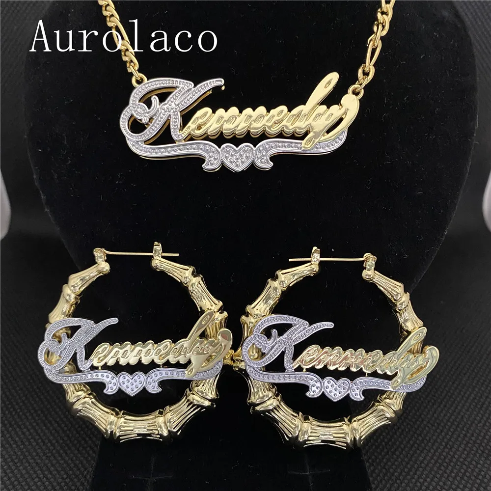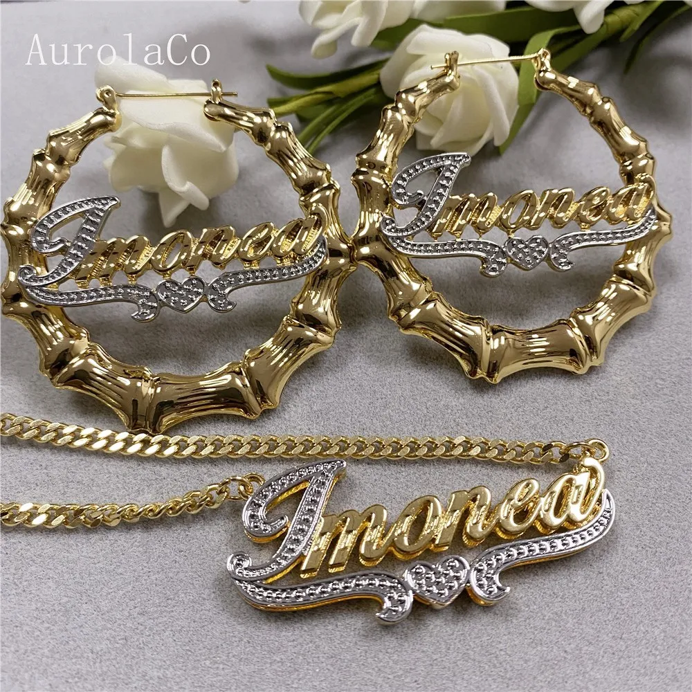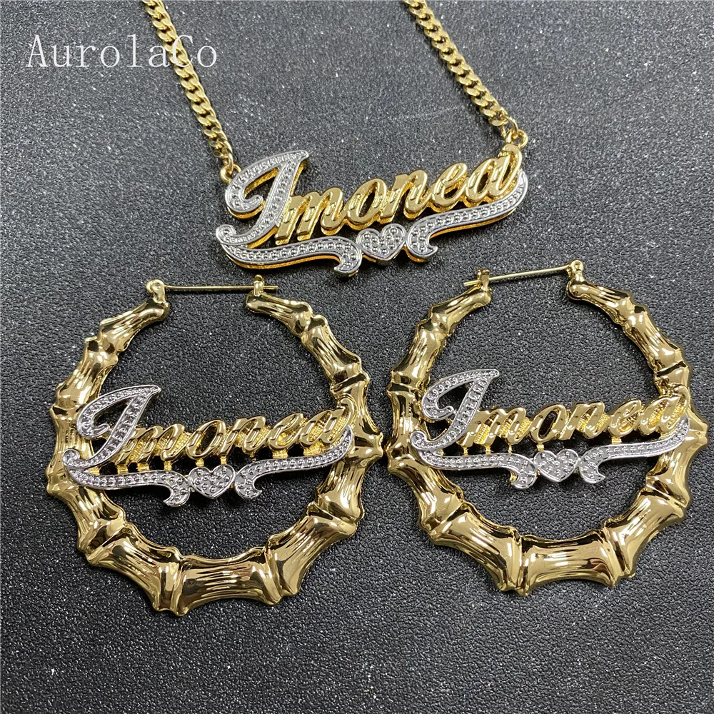 Комплект ювелирных изделий AurolaCo с именем на заказ, 3D Двойная табличка, ожерелье, серьги с именем на заказ, золотые круглые серьги, праздничные подарки