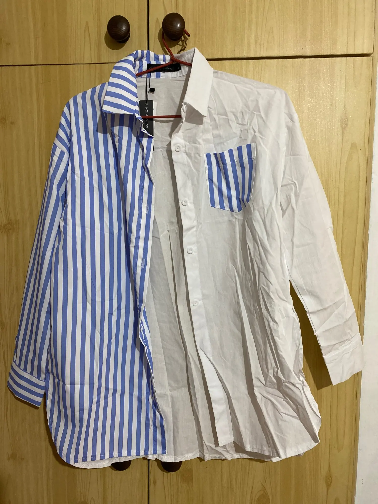 белая часть рубашки хлопковая, полосатая синтетика, смотрится не очень и слишком высокие разрезы по бокам рубашки, доходят до талии