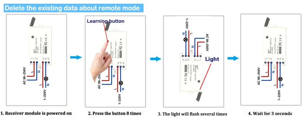 -Настройка режима переключения1. Нажмите кнопку обучения (на приемнике)Дважды. Подождите 3 секунды;2. Нажмите одну кнопку на пульте дистанционного управления. Подождите 3 секунды. Преуспевает.