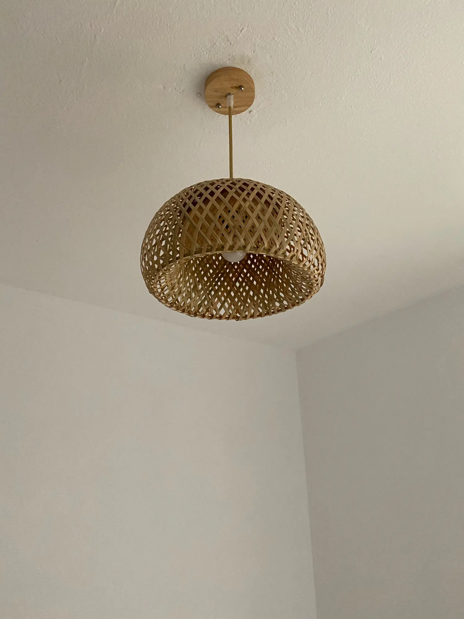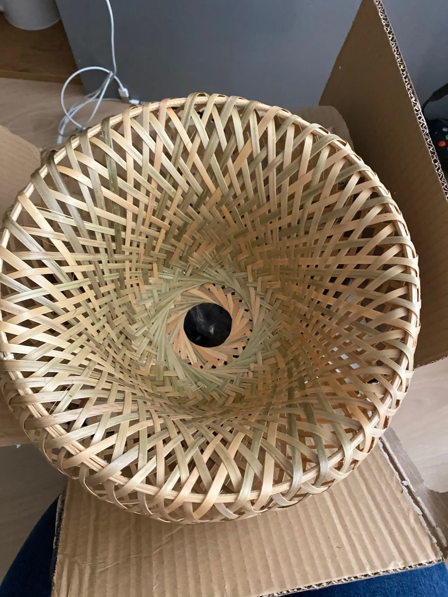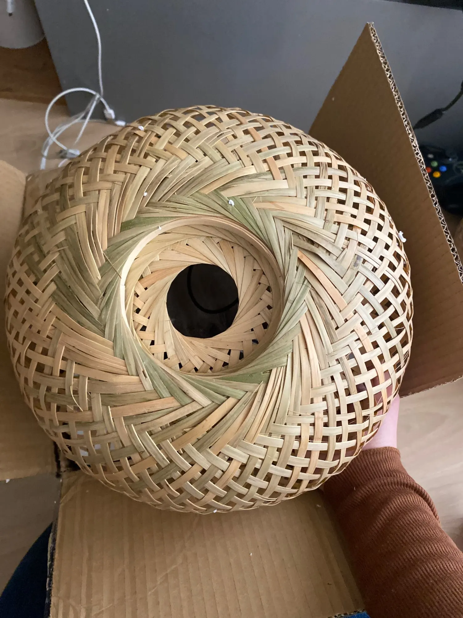 Здравствуйте, сам товар мне понравился, корзина соответствует цвету и описанию, а провод и фурнитура очень качественные, не уступают Икее ! Но в моем заказе был нюанс с упаковкой, и коробка с пенопластом была гораздо меньше самой корзины из бамбука ! Из за этого ,пенопласт продавил внешнюю часть корзинки и я достал ее просто квадратной ! это видно на фото, что корзина гораздо шире чем пенопласт в коробке. И мне пришлось протягивать нитку под бамбук и выпрямлять стенки корзинки ! Благо, что все получилось и мне удалось вернуть круглую форму корзине. магазину стоит уделить больше внимания упаковке !