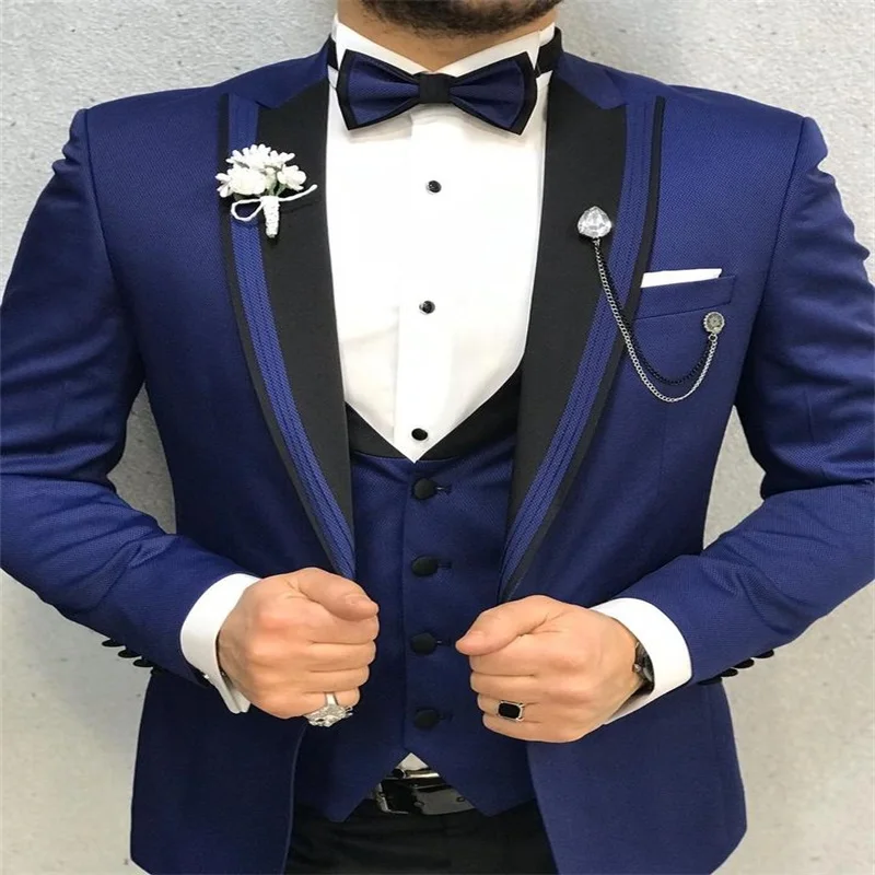 Мужские костюмы из 3 предметов, королевский синий свадебный костюм на заказ, современные хлопковые костюмы с лацканами, высококачественное красивое деловое пальто + брюки + жилет